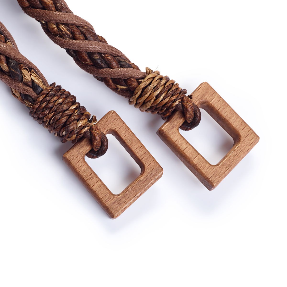 Asas de bolso modelo "Madeleine". Miden 34cm y están fabricadas completamente en fibras naturales trenzadas de tonos marrones. Los conectores de madera real en forma cuadrada. Ideales para bolsitos cortos.