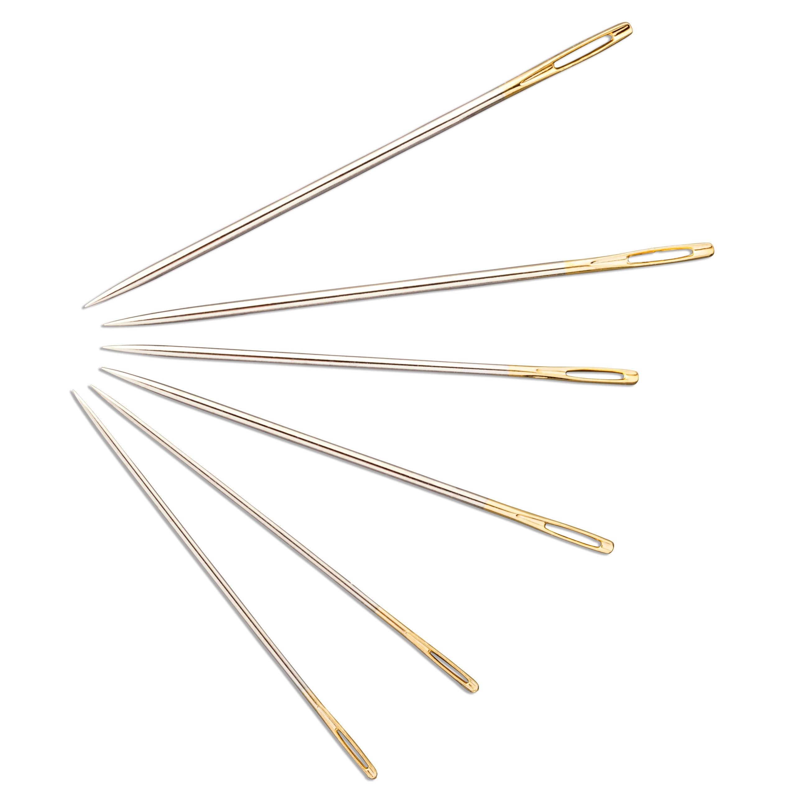 Compra estas agujas largas Prym para zurcir a mano. El paquete incluye 10 agujas de dfirentes tamaños de acero reforzado con punta cónica del número 1 hasta el 5. La aguja es plateada y tiene el ojo de color dorado, son perfectas para todo tipo de zurcido.
