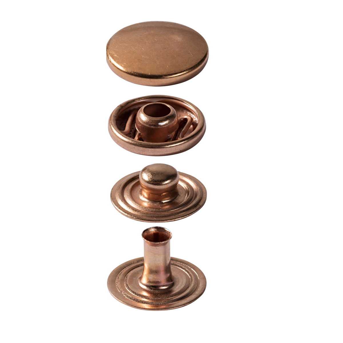 Cierres de presión Anorak de 15mm Prym. Están fabricados con latón inoxidable de color cobre brillante, tienen una fuerza media alta y son adecuados para cerrar faldas, pantalones, chaquetas, y prendas de piel fina.