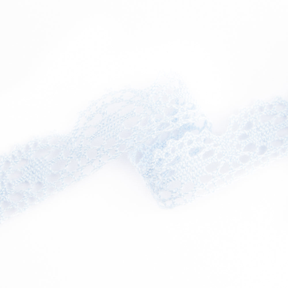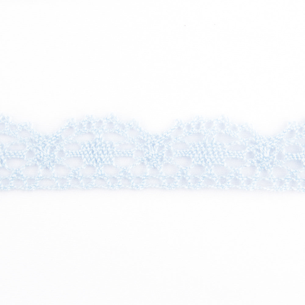 Tira de puntilla de poliéster en color azul celeste. Tira de puntilla calada en forma de ondas de 2 cm de ancho toda del mismo color. Compra a partir de 1 metro, compra los metros de puntilla que necesites. Precio en oferta hasta agotar existencias.