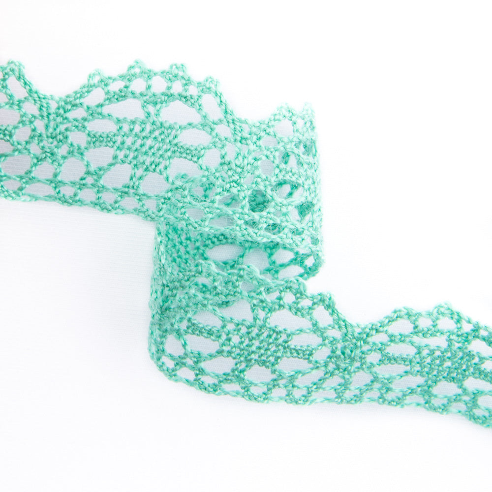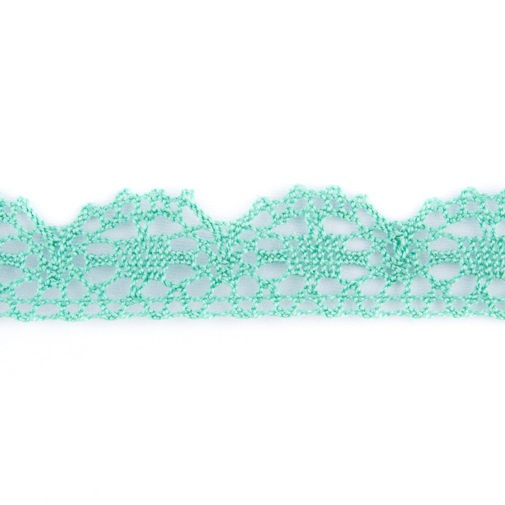 Tira de puntilla de poliéster en color Verde Anís. Tira de puntilla calada en forma de ondas de 2 cm de ancho toda del mismo color. Compra a partir de 1 metro, compra los metros de puntilla que necesites. Precio en oferta hasta agotar existencias.
