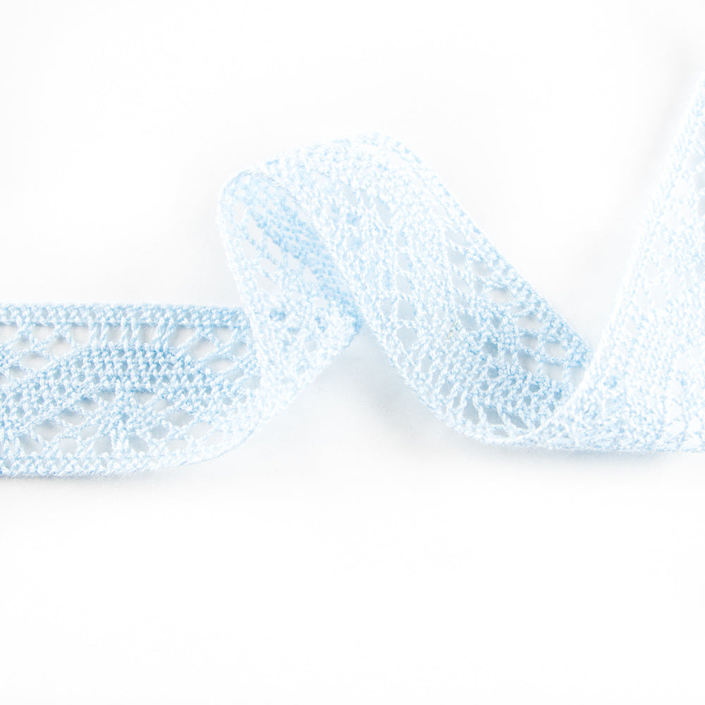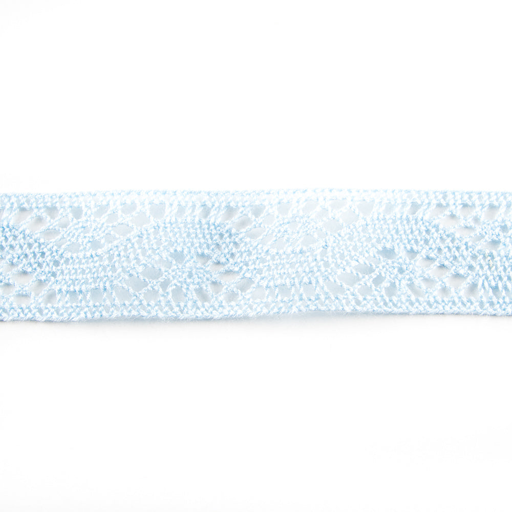 Puntilla de poliéster en color celeste. Tira de puntilla calada de 3,50 cm de base de ancho toda del mismo color. Compra a partir de 1 metro, compra los metros de tira que necesites. Precio en oferta hasta agotar existencias.