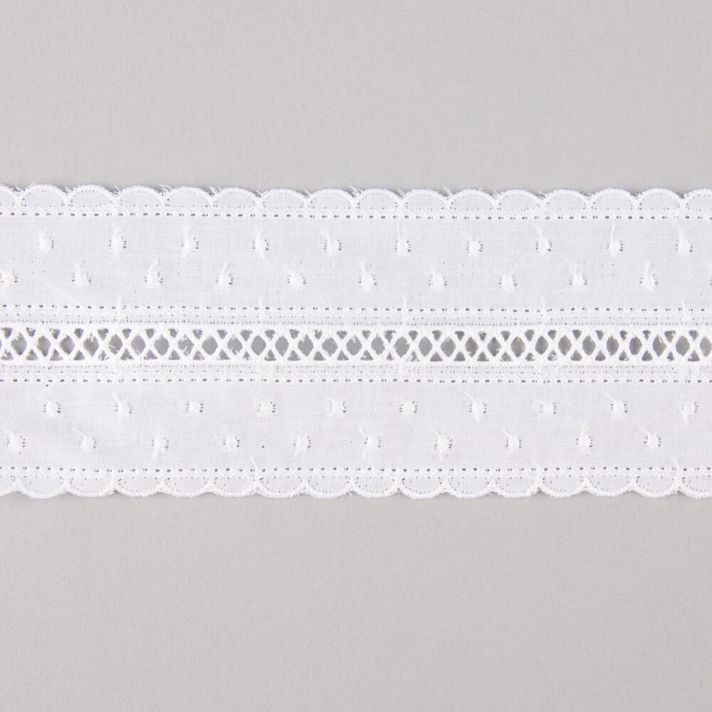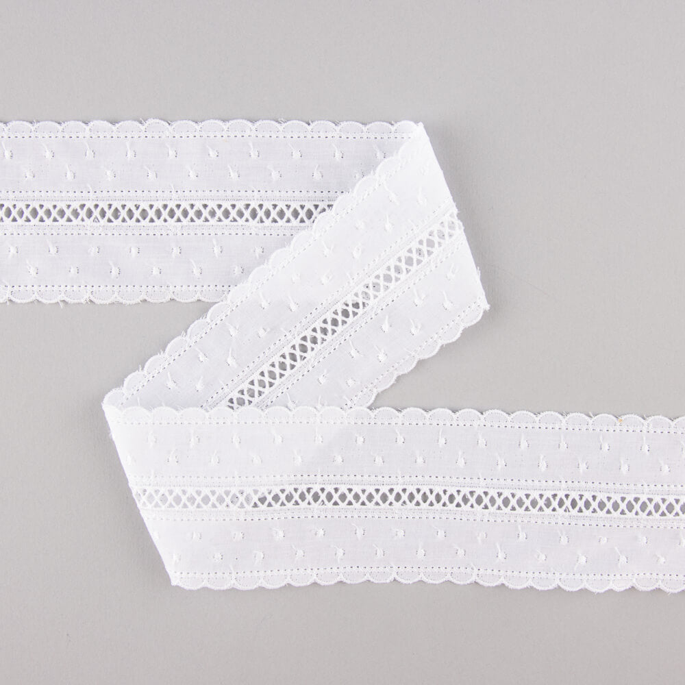 Tira de batista bordada en algodón color blanco con un ancho máximo de 5,5 cm.