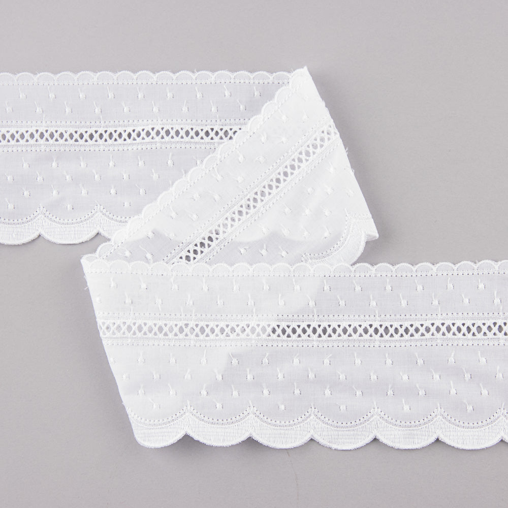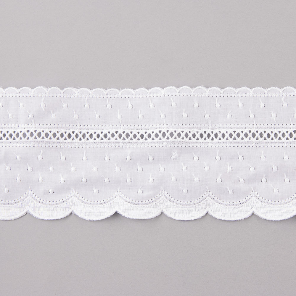 Tira de batista bordada en algodón color blanco con un ancho máximo de 7,5 cm.