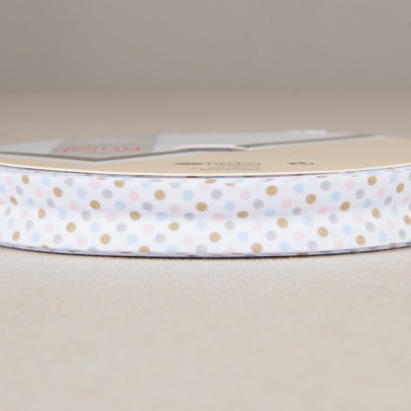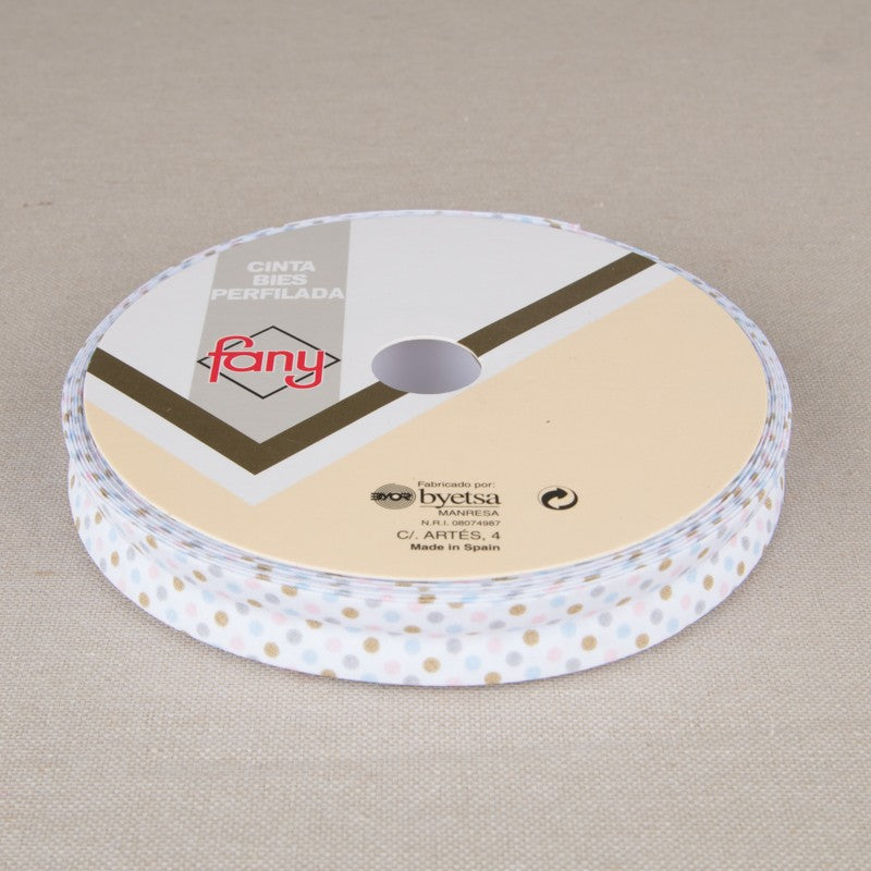 Cinta bies de 18 milímetros de ancho con pequeños lunares multicolor. Cintas bies de colores por metros en nuestra mercería online.