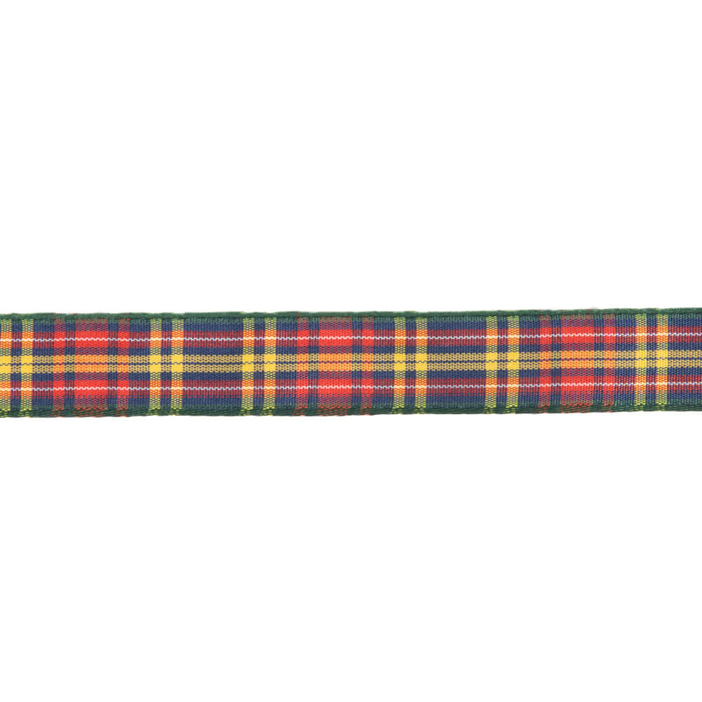 Cinta de poliéster a cuadros combinando rojo, verde y amarillo, disponible en ancho de 15 milímetros.