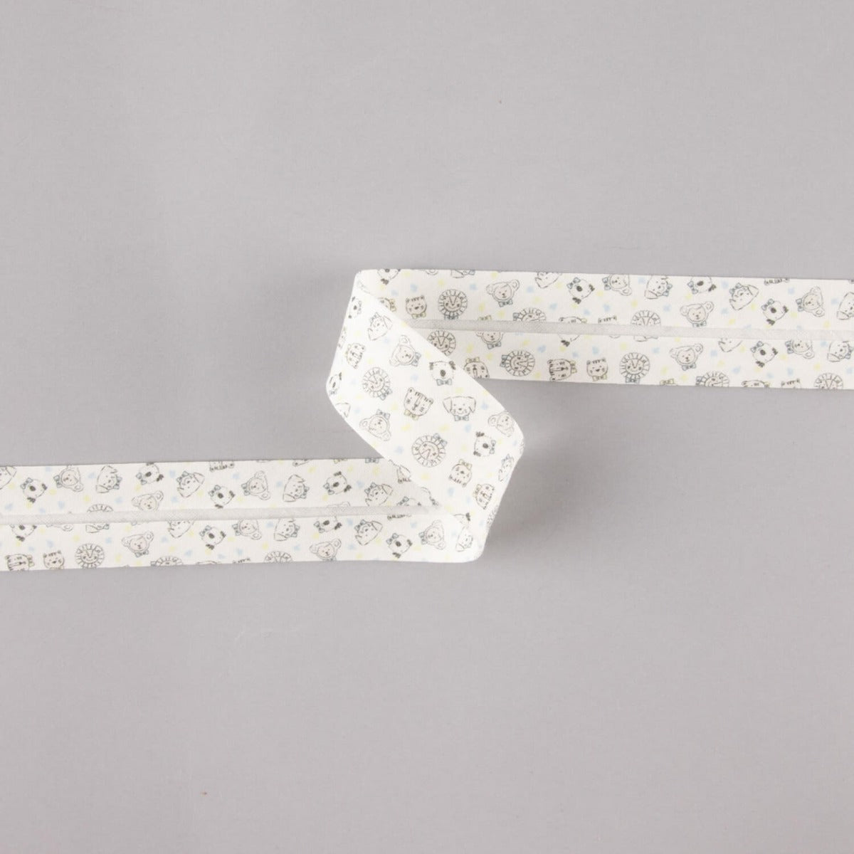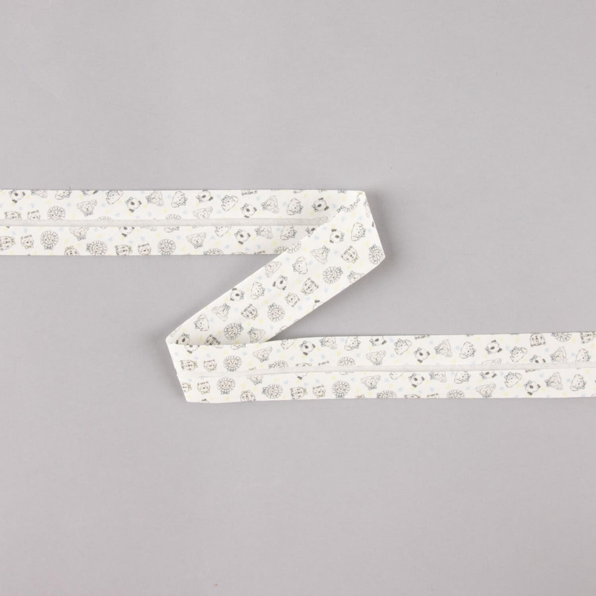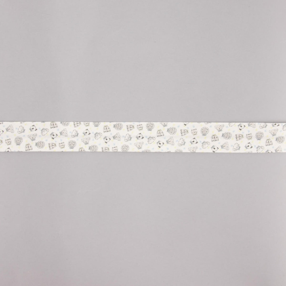 Aporta un toque tierno y colorido a tus creaciones con esta encantadora cinta al bies de 18 mm en algodón orgánico 100%, decorada con un divertido estampado de caritas de animalitos acompañadas de pequeñas motitas en tonos azul y verde claro sobre fondo blanco.