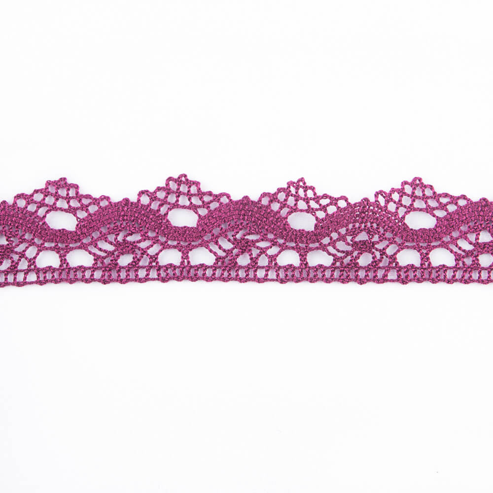 Tira de puntilla en color malva oscuro. Tira de puntilla calada en forma de ondas de 3 cm de base de ancho en su zona más ancha y 2,3 cm en la menos ancha, toda del mismo color. Compra a partir de 1 metro, compra los metros de puntilla que necesites. Precio en oferta hasta agotar existencias.