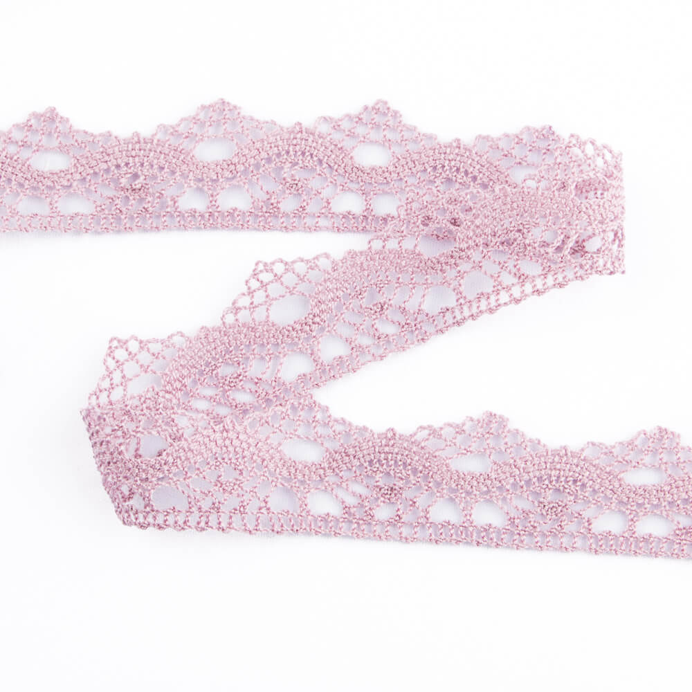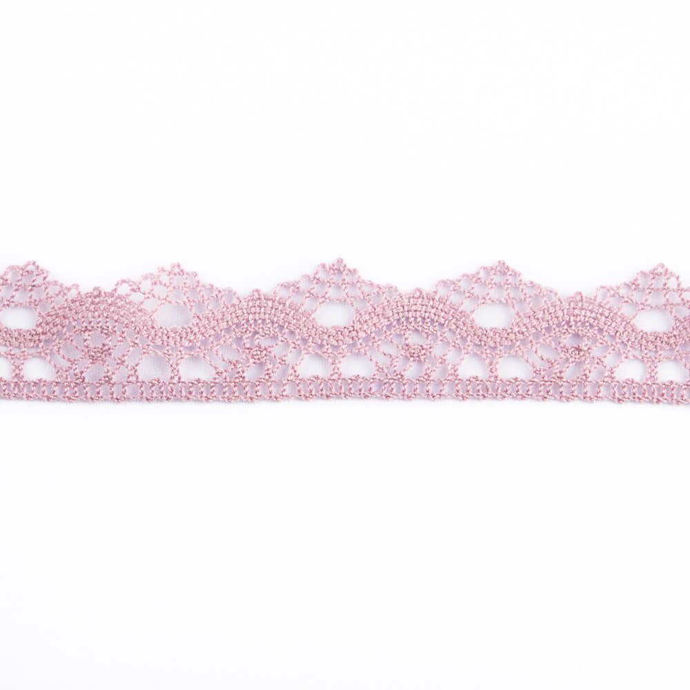 Tira de puntilla en color rosa fucsia. Tira de puntilla calada en forma de ondas de 3 cm de base de ancho en su zona más ancha y 2,3 cm en la menos ancha, toda del mismo color. Compra a partir de 1 metro, compra los metros de puntilla que necesites. Precio en oferta hasta agotar existencias.