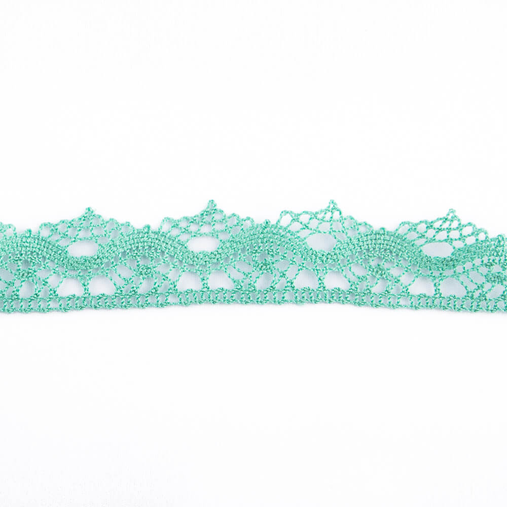 Tira de puntilla en color Verde. Tira de puntilla calada en forma de ondas de 3 cm de base de ancho en su zona más ancha y 2,3 cm en la menos ancha, toda del mismo color. Compra a partir de 1 metro, compra los metros de puntilla que necesites. Precio en oferta hasta agotar existencias.