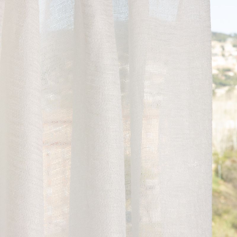 Confección a medida de cortinas con rizo en tejido lino premium color blanco natural de visillo desde Ribes & Casals. Puedes elegir entre confección tipo: automático y onda perfecta. Ideales para aportar elegancia y luminosidad a tus espacios. Diseñadas según tus medidas exactas, te asesoramos sobre el metraje necesario recomendamos el doble o triple de tu ventana, dependiendo del fruncido deseado. Disfruta de la comodidad de nuestro servicio con entrega a domicilio, para que recibas tus cortinas listas para instalar. El tejido: Tela de gasa lino de gramaje 100gr/m2 de gran calidad y ligereza en color blanco natural con un ancho de 310cm. Tela de lino fina y ligera, con una transparencia sutil de tacto suave y agradable perfecto para cortinas livianas, detalles decorativos o prendas de verano así como pañuelos. Su peso ligero proporciona comodidad y fluidez, permite confeccionar prendas duraderas debido a su calidad. Recomendamos para una mejor conservación y mantenimiento lavado en seco.