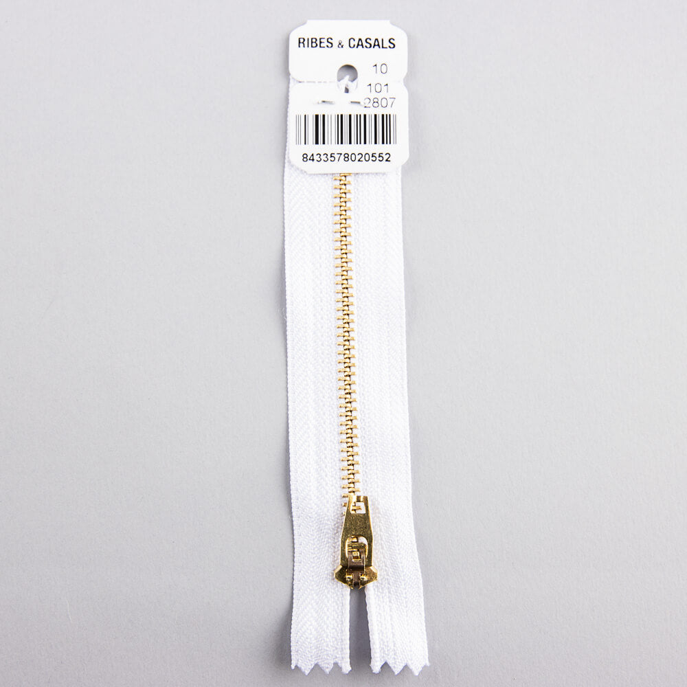 Cremallera cerrada de malla 3 con dientes en metal dorado sobre malla blanco.