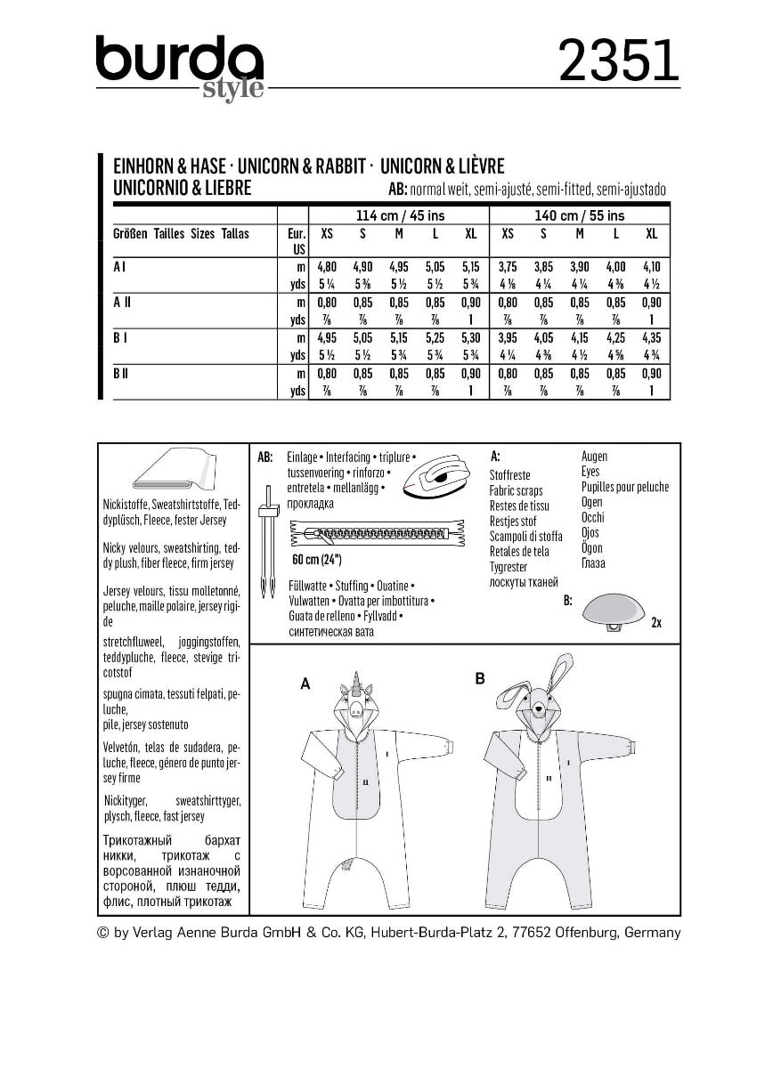 Patrones Burda para 2 simpáticos disfraces de unicornio y liebre.
