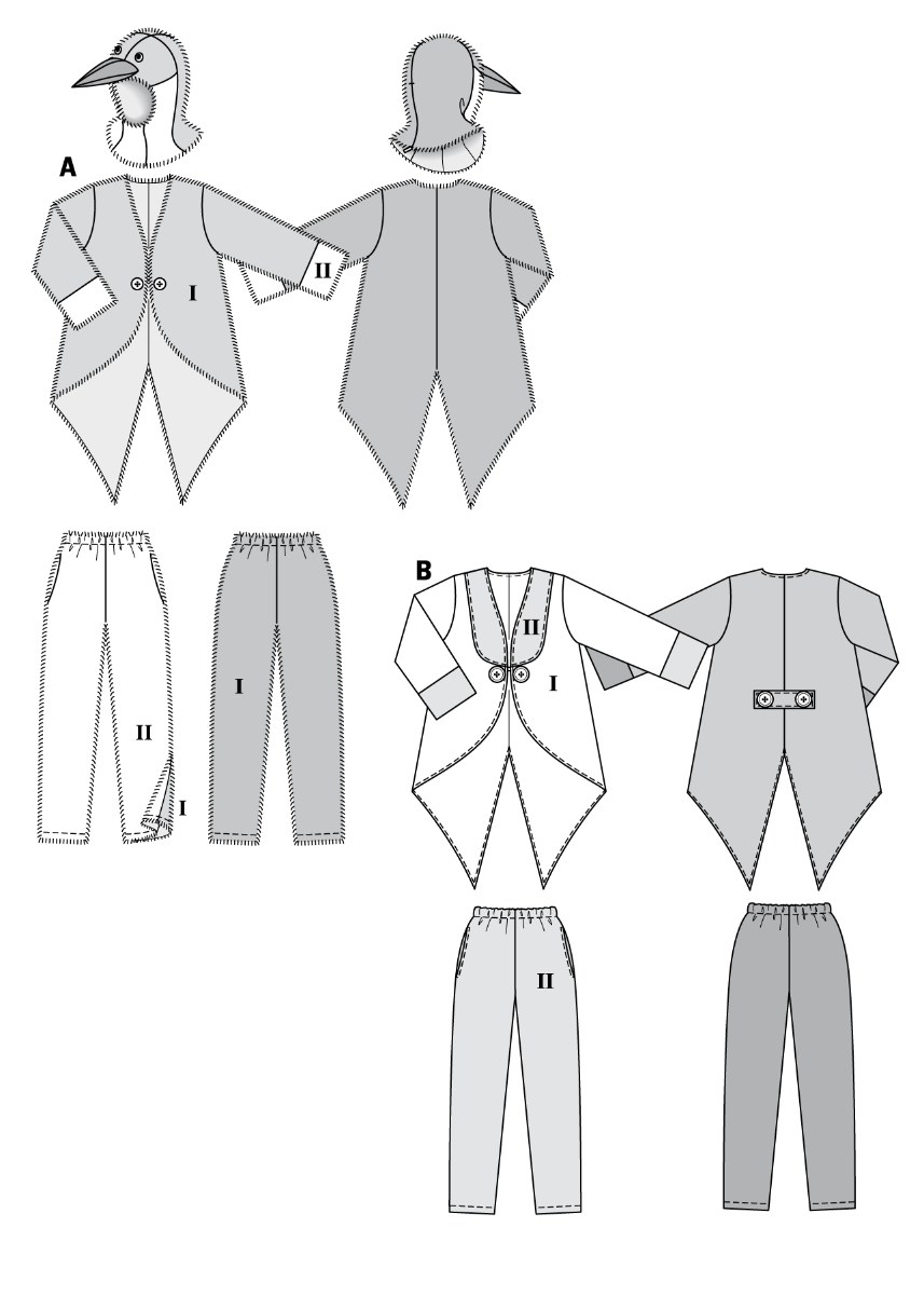 Patrones Burda para 2 disfraces de carnaval, pingüino y payaso.