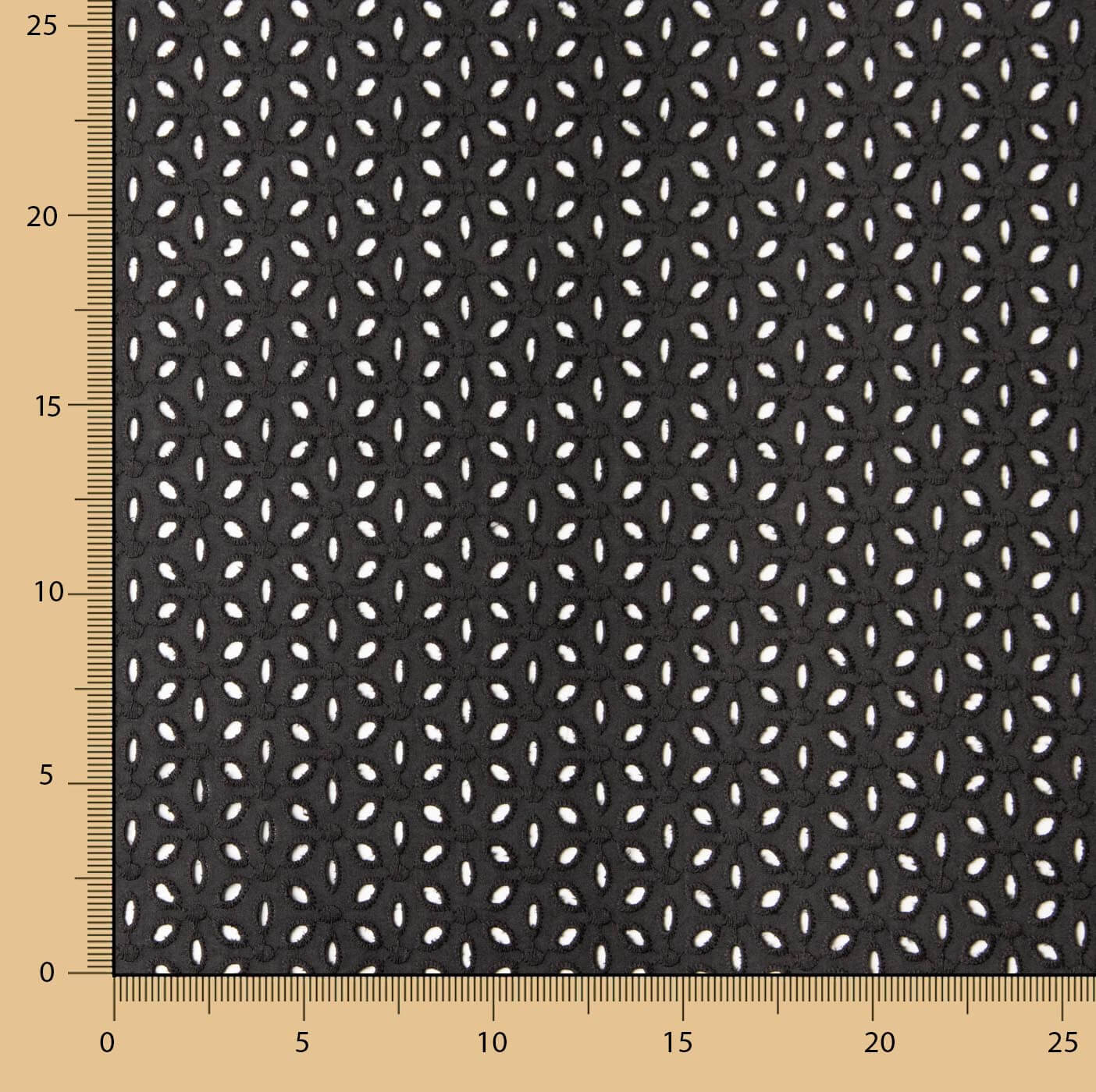 Tela con bordado suizo perforado pétalos negro. Tela de algodón 100% tipo voile de color blanco, suave, ligeramente sostenida. Bordado calado flamenco de algodón fino, de tacto natural y con relieve creado por el propio bordado. Tejido bordado de gran calidad, que intercala un gracioso perforado muy sutil aportando un juego de transparencias fresco y juvenil. Tela ideal para la confección de trajes de sevillana, aplicaciones y volantes de flamenca. Puedes utilizar este tipo de bordado suizo de voile para tus creaciones más frescas, aportando un aire romántico y desenfadado: vestidos ibicencos, blusas, tops, faldas… así como para complementos y adornos.