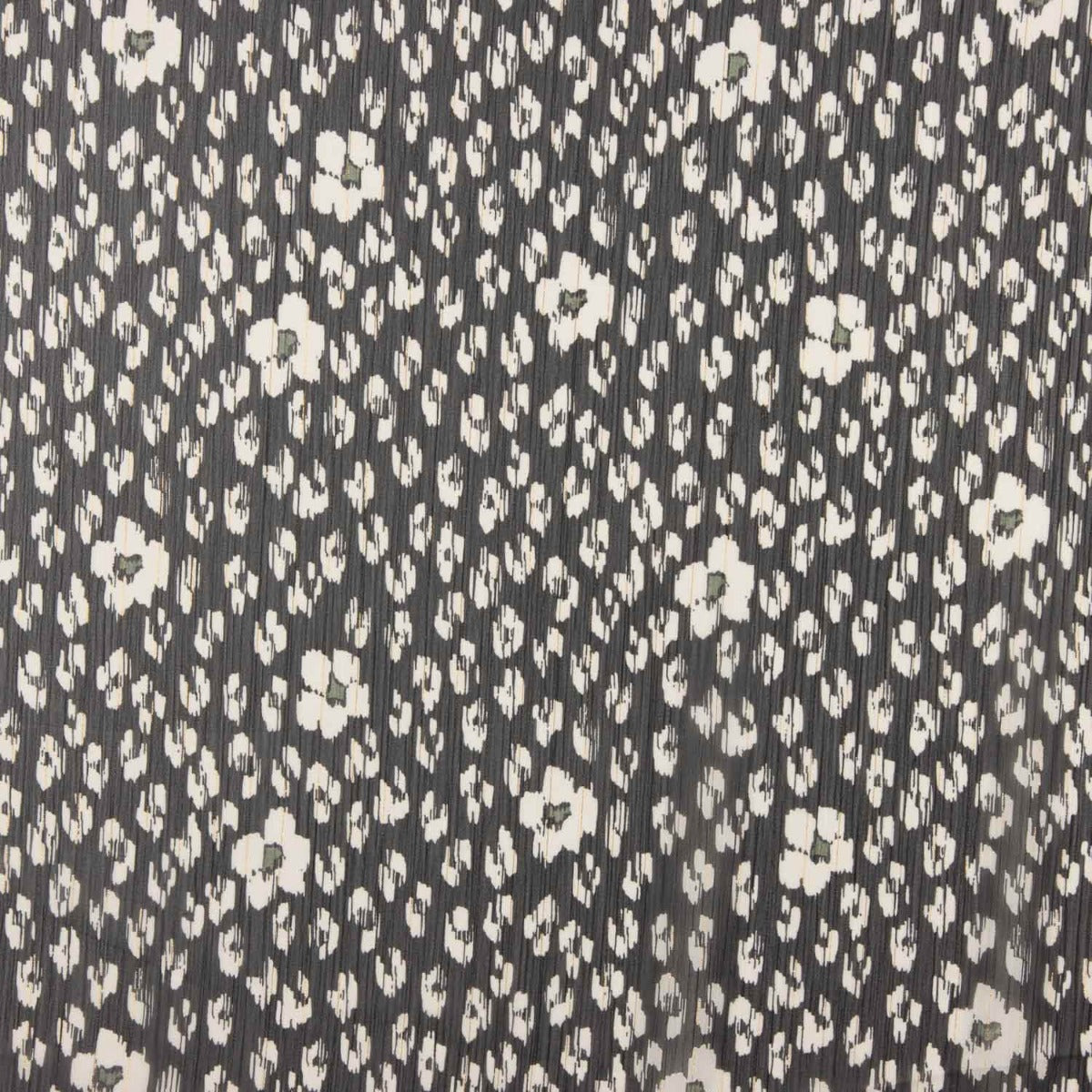 Con un fondo gris antracita y pequeñas flores blancas, esta tela incorpora sutiles hilos metálicos que aportan destellos elegantes y femeninos.