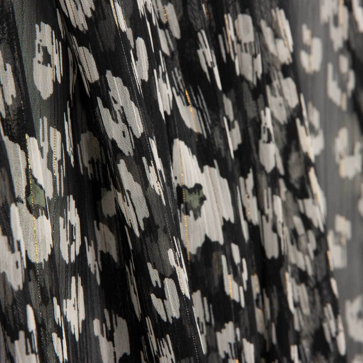 Confeccionada en poliéster 100% y con un ancho de 150 cm, esta gasa estampada combina fluidez, transparencia y un brillo muy actual.