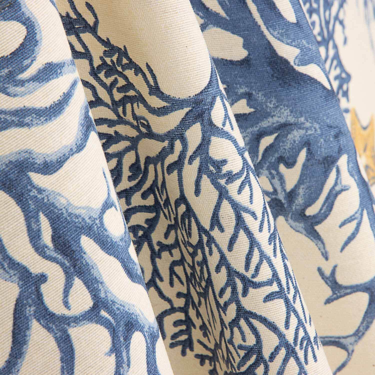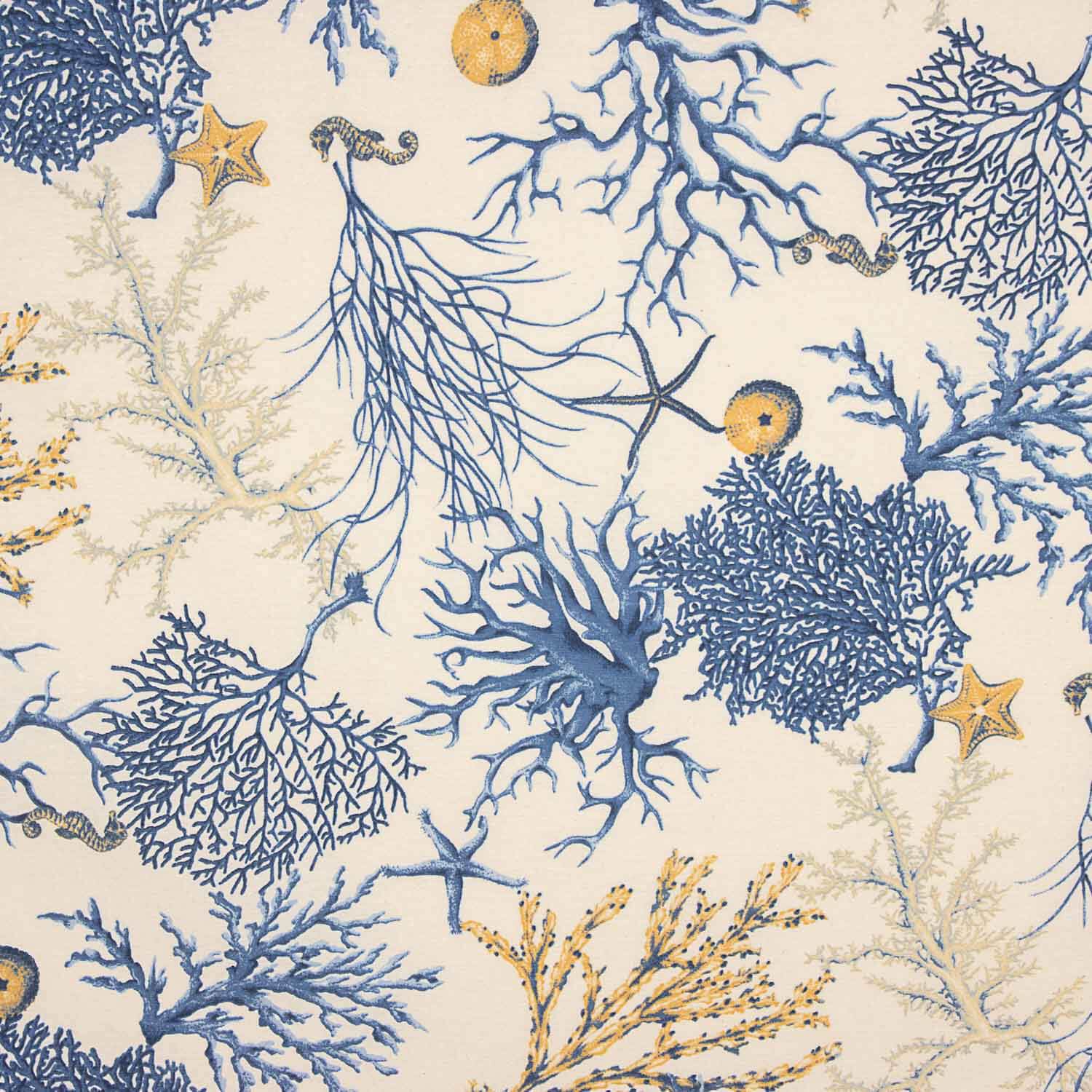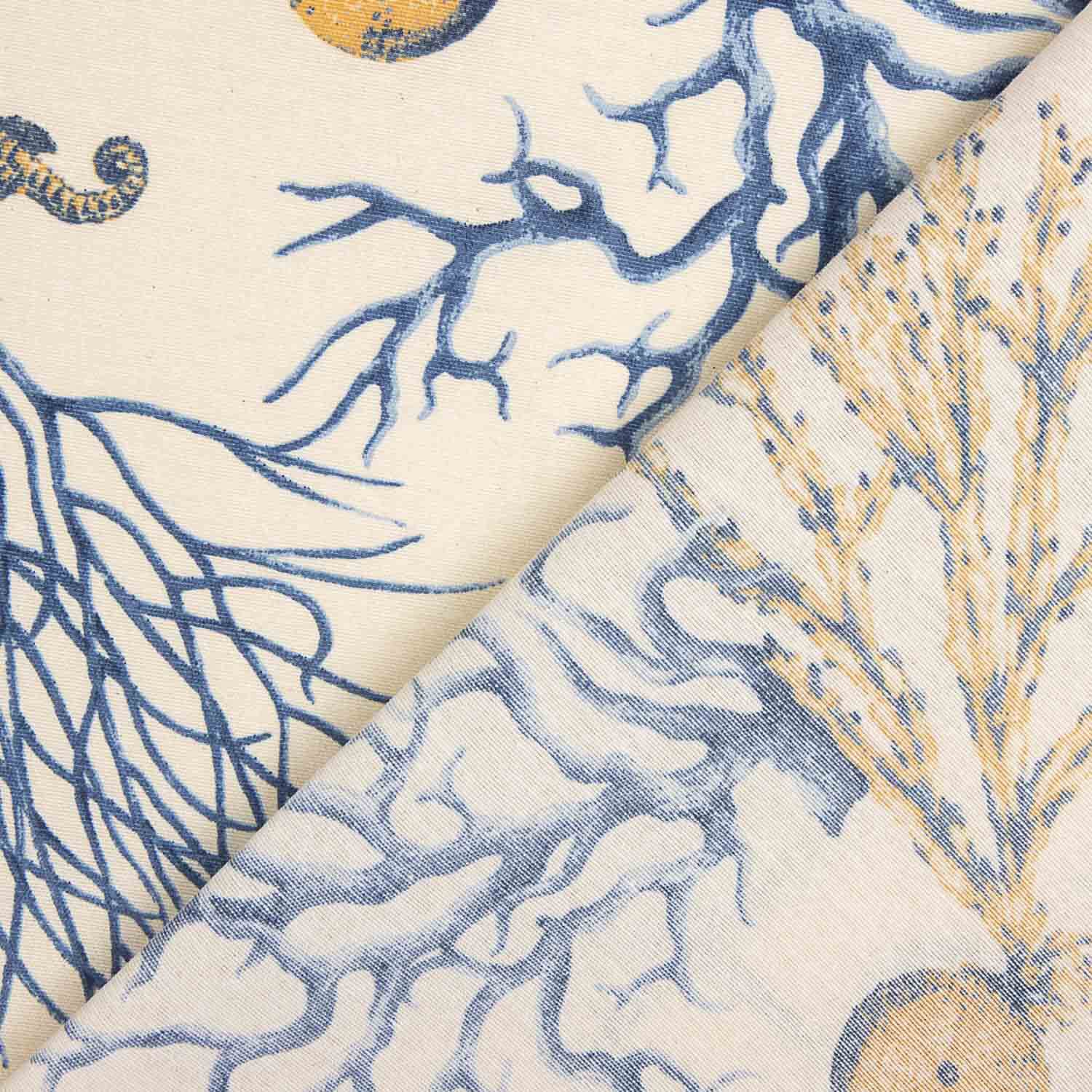 La Loneta Coral Azul destaca por su elegante estampado de inspiración marina, con corales, estrellas y formas submarinas en tonos azules y arena sobre fondo claro, aportando frescura y un estilo mediterráneo muy decorativo.