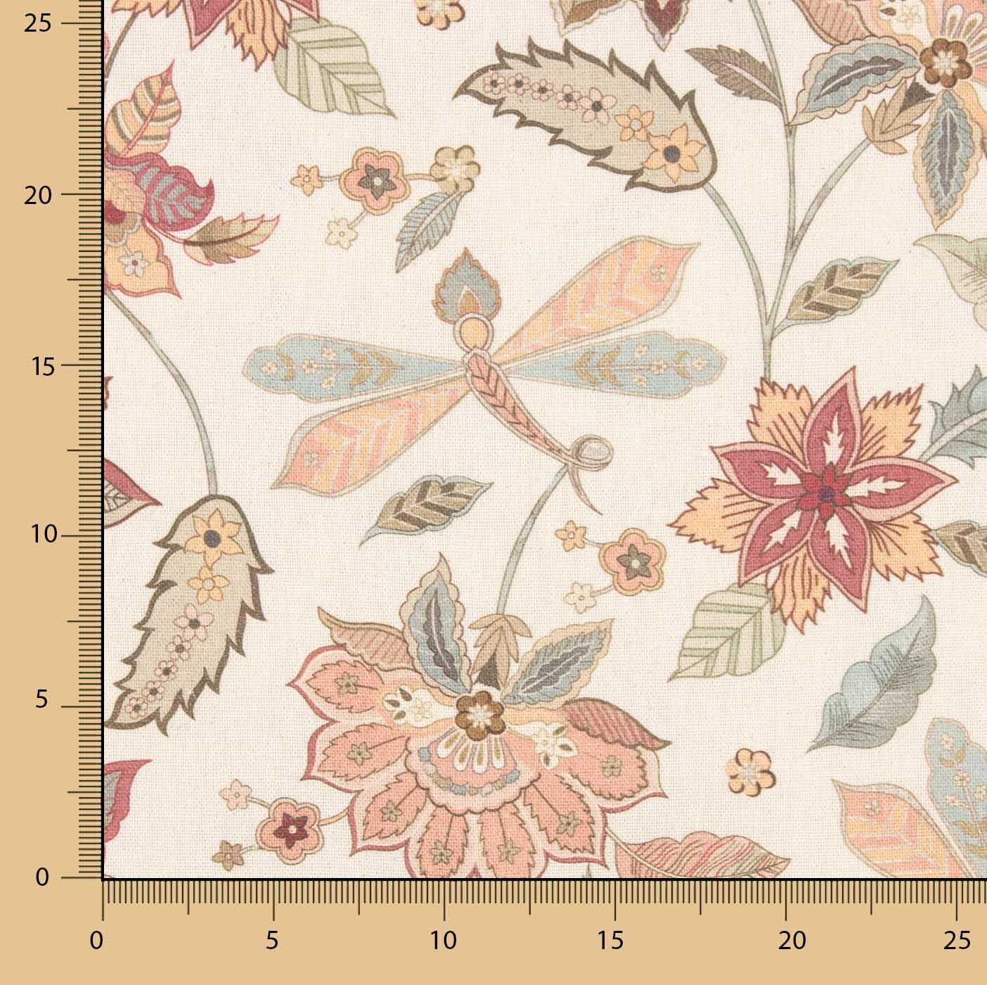 Loneta panamá 100% algodón con un delicado estampado de flores y libélulas en tonos suaves empolvados sobre fondo claro, que transmite elegancia, frescura y un aire romántico.