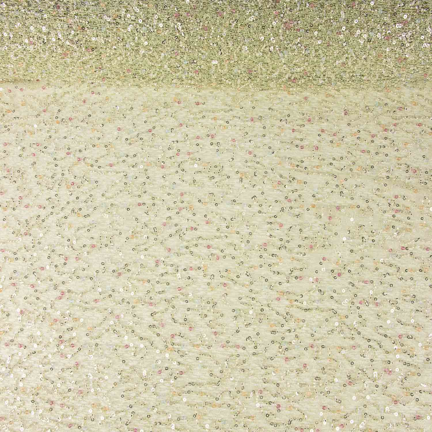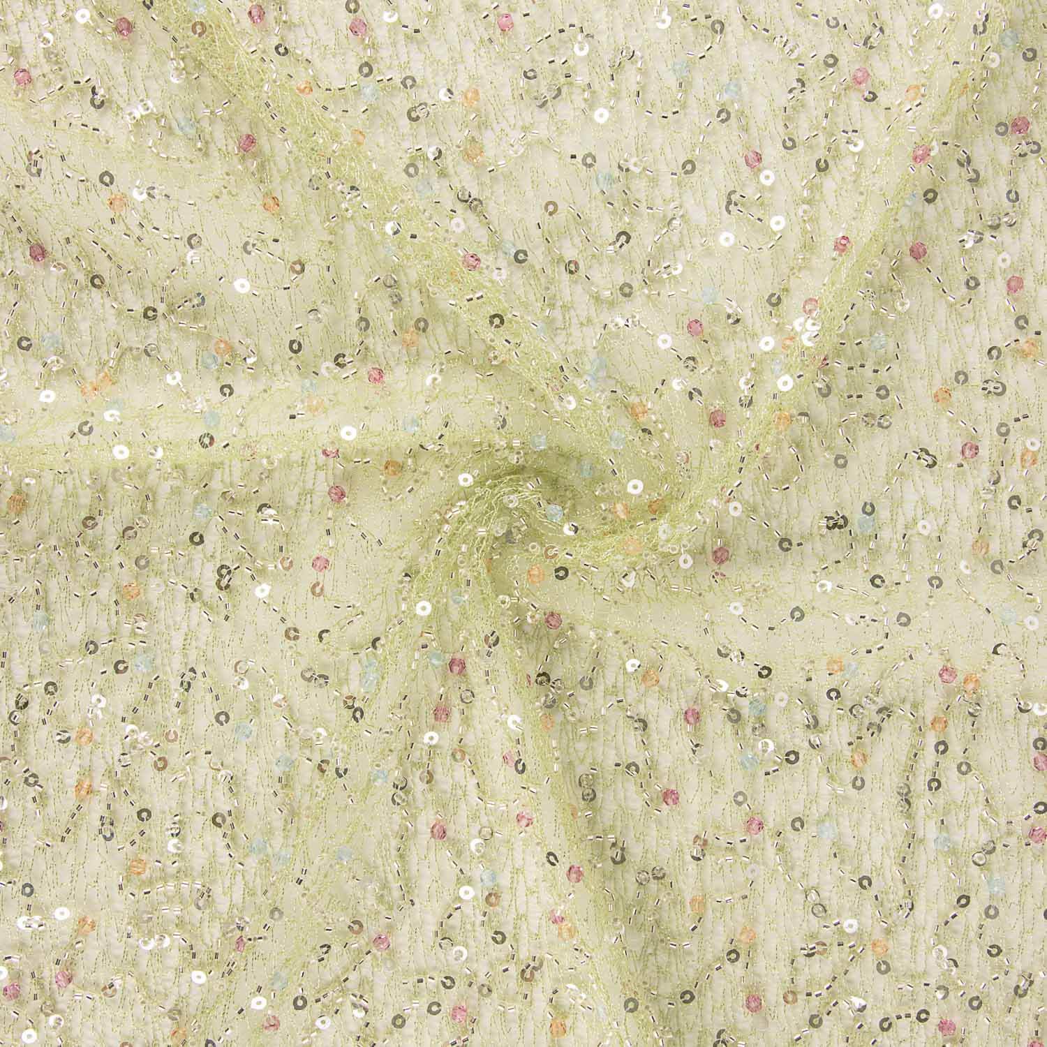 Tela de pedrería de tul modelo verde pausini con peso. Base de tul transparente de color rosa claro bordado con cristales y lentejuelas en tonos a juego que aportan destellos y brillos en tus creaciones. Acabado en ambos orillos en onda, que puedes utilizar como terminación en bajo, escote, cintura o mangas. Tela pedrería bordada en tul con espacios sin bordado creando transparencias pudiendo cubrirlas con tejidos de forro a tono como: crep, satén… Ten especial cuidado a la hora de confeccionar retirando manualmente las piedrecitas y lentejuelas en las zonas de costura y posteriormente vuelve a engarzarlas cubriendo los espacios para dar un acabado profesional.