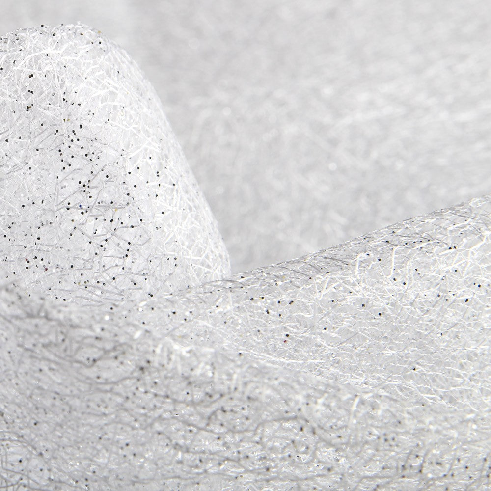 Tela de tul lamé blanco imitando a la malla de tela de araña. Tela de carnaval sermirígida para decoraciones o disfraces de fantasía.