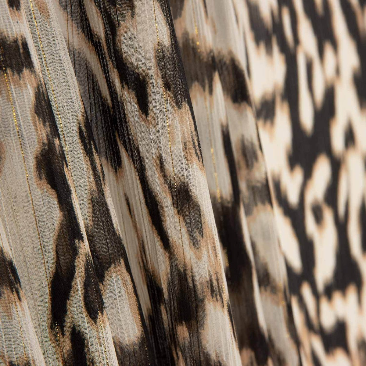 Su estampado abstracto en tonos beige y negro, sobre fondo arrugado tipo bambula y con hilos metálicos de lúrex sutilmente integrados, le da un toque moderno y elegante, ideal para vestidos vaporosos, blusas, camisas oversize, kimonos, faldas largas o pañuelos.