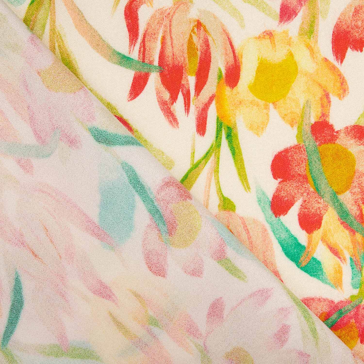 La tela de crepé viscosa estampada Flores Acuarela Cálida presenta un delicado diseño floral con efecto acuarela en tonos suaves de coral, amarillo, verde y pinceladas en tonos pastel, creando un estilo artístico, ligero y muy elegante.