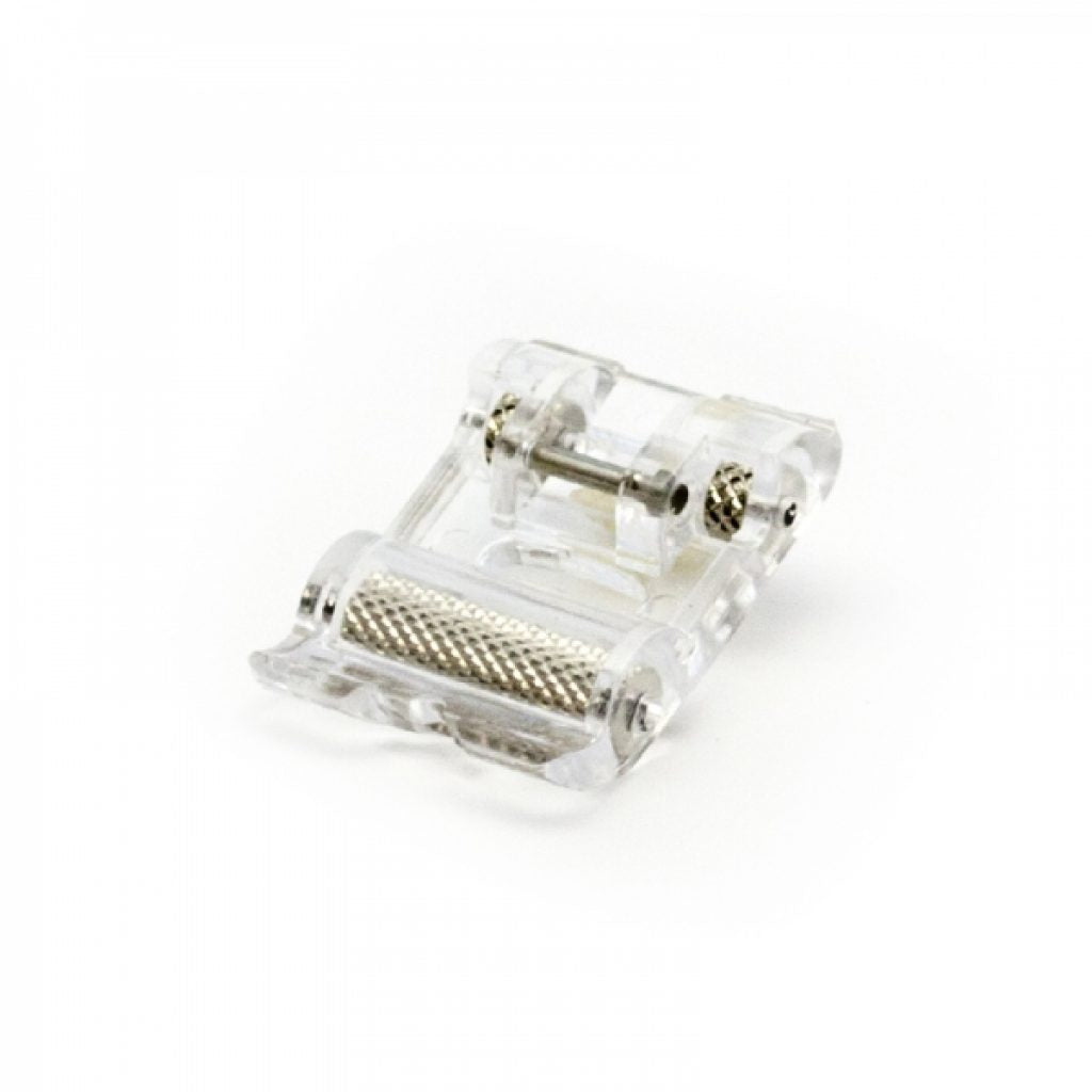 El rodillo estriado nos ayuda a transportar tejidos o materiales plásticos o que se quedan adheridos a la base del prensatelas normal.