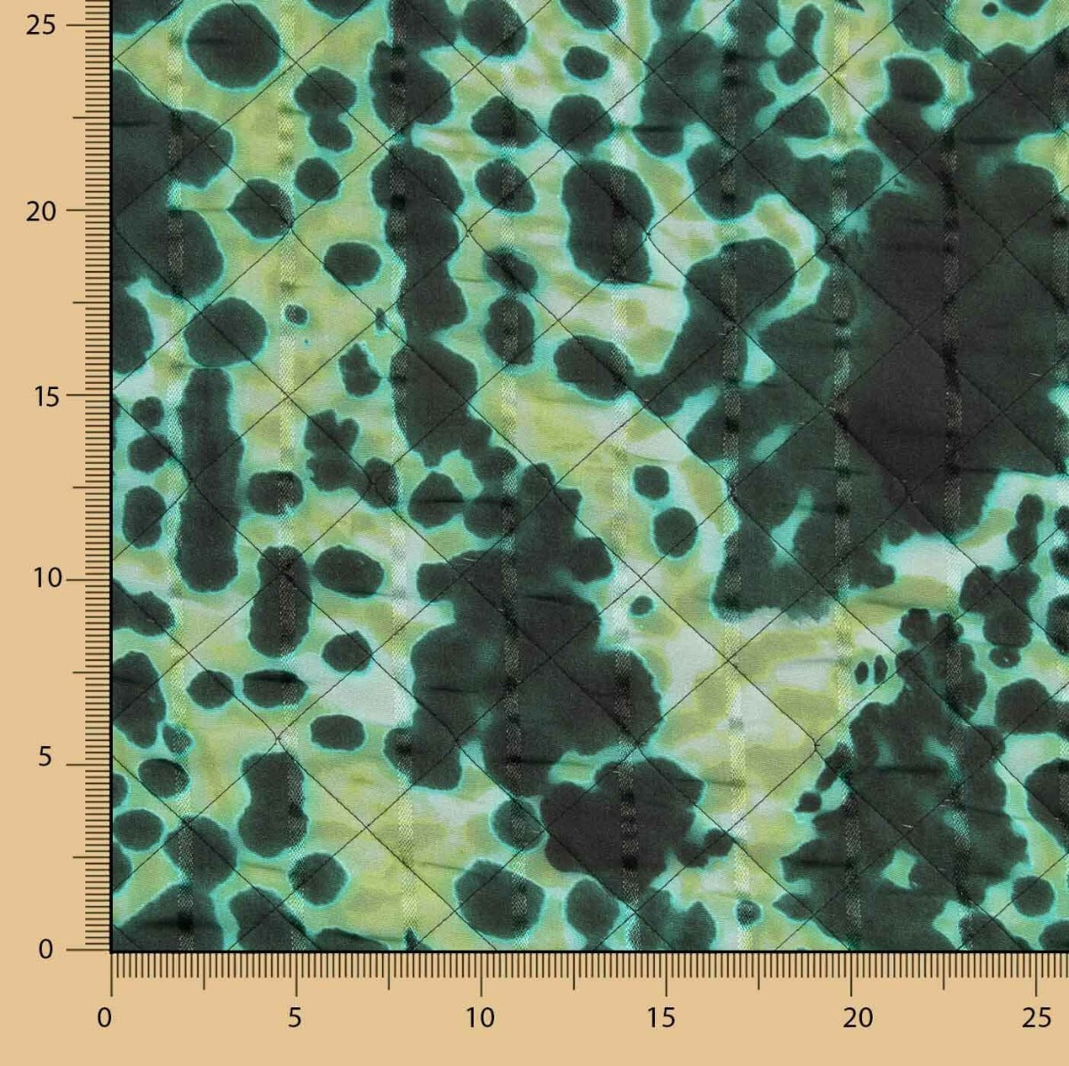 Tela acolchada bicolor con un diseño único: por una cara, una viscosa estampada con efecto camuflaje acuarelado en tonos verdes y negros; por la otra, una fina polipiel negra que aporta estructura y resistencia.