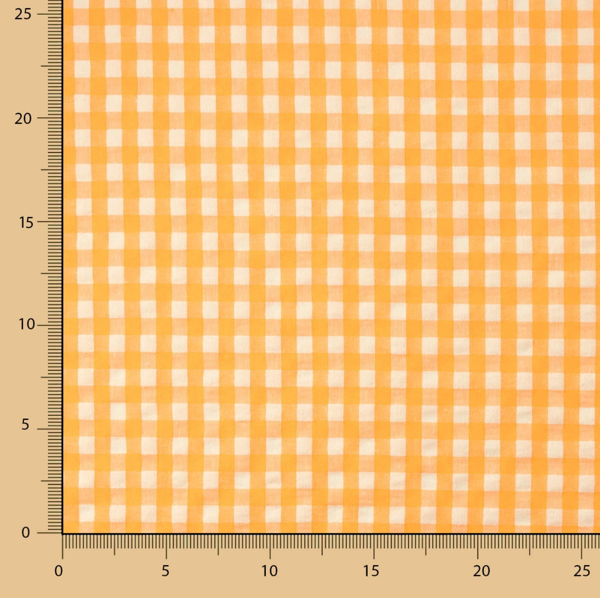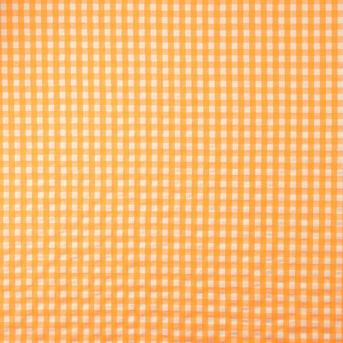 Dale un aire fresco, ligero y moderno a tus creaciones con esta tela batista estilo seersucker de cuadros vichy en tono naranja flúor.