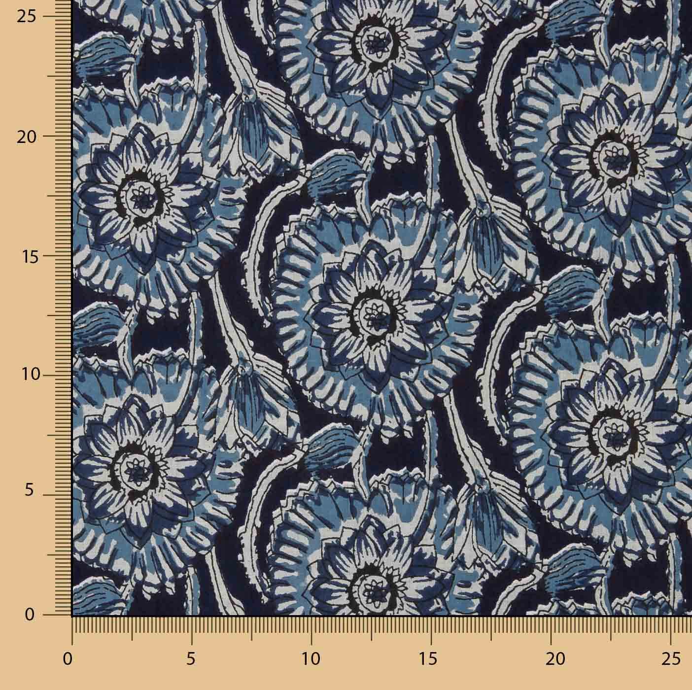 La tela voile de algodón estampado Espirales Batik Índigo es un tejido ligero y con gran encanto artesanal que presenta un delicado diseño de flores y espirales de inspiración batik en tonos blancos sobre un fondo azul índigo profundo, evocando un estilo fresco, natural y atemporal.