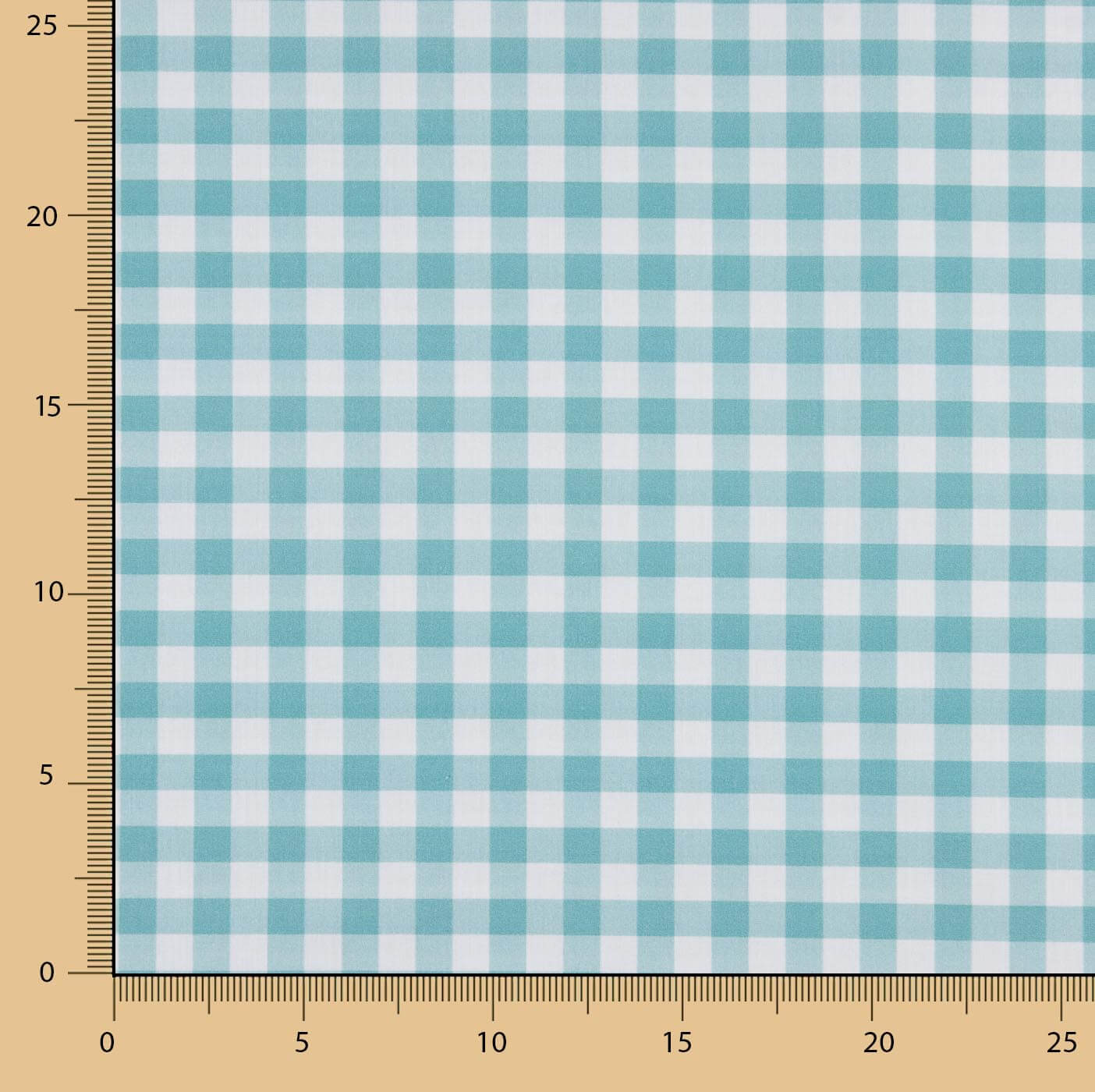 Percal Estampado Cuadros Medio Turquesa confeccionado en algodón 100% y tejido en percal de 200 hilos, que garantiza suavidad, frescura y excelente resistencia. Presenta un estampado digital de cuadros en tonos turquesa y blanco, con un tamaño aproximado de 1 cm por lado, ideal para confección y decoración textil.