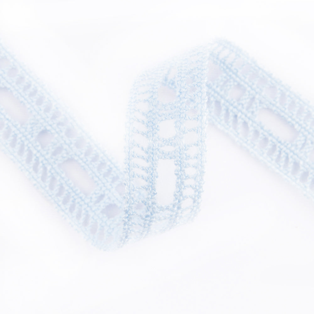 Tira de puntilla de poliéster en color Celeste. Tira de puntilla calada de 2 cm de base de ancho toda del mismo color.