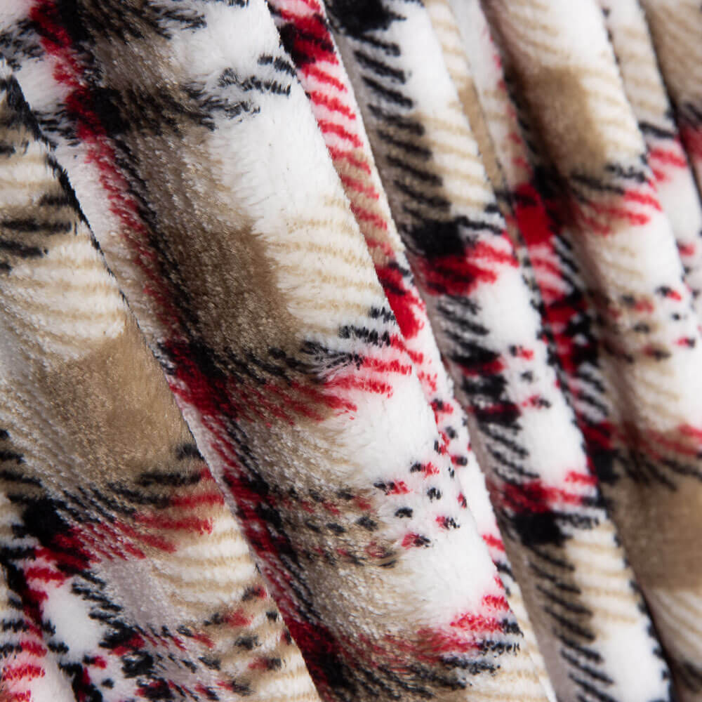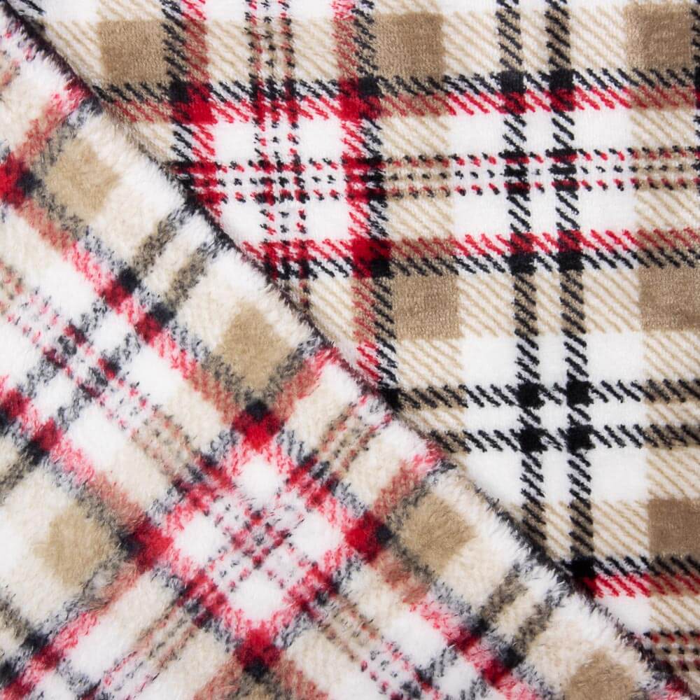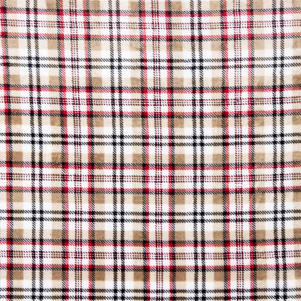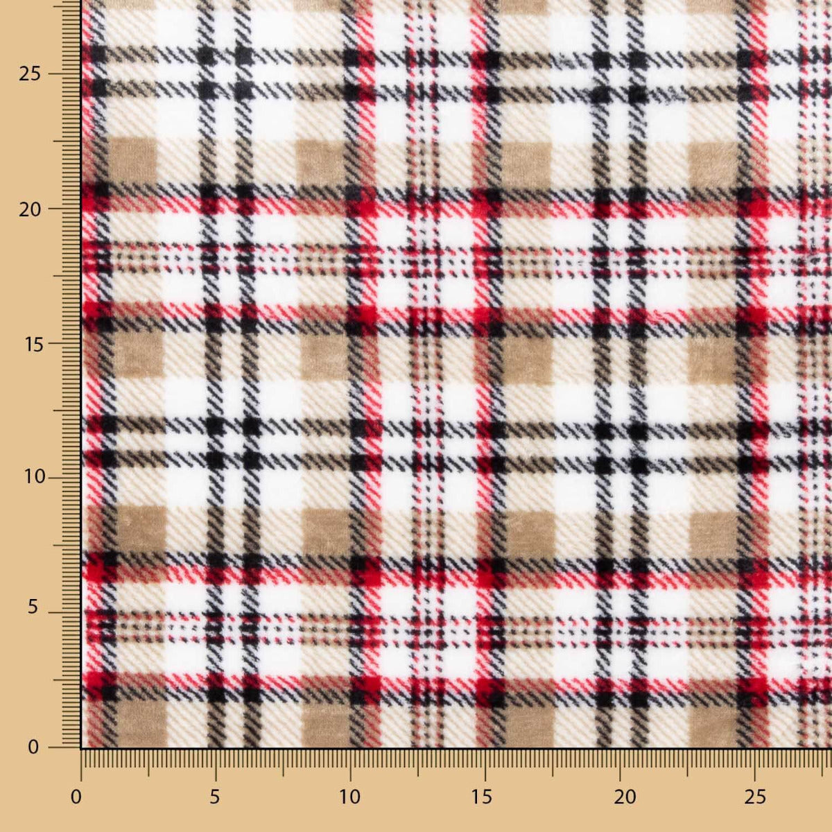 Tela de coralina muy suave con dibujo de cuadros combinando líneas rojas y negras sobre tonos marrones. La coralina es un tejido ligero y cálido de pelo corto que proporciona un tacto extra suave. Ideal para ropa de abrigo, mantas, batas, pijamas…