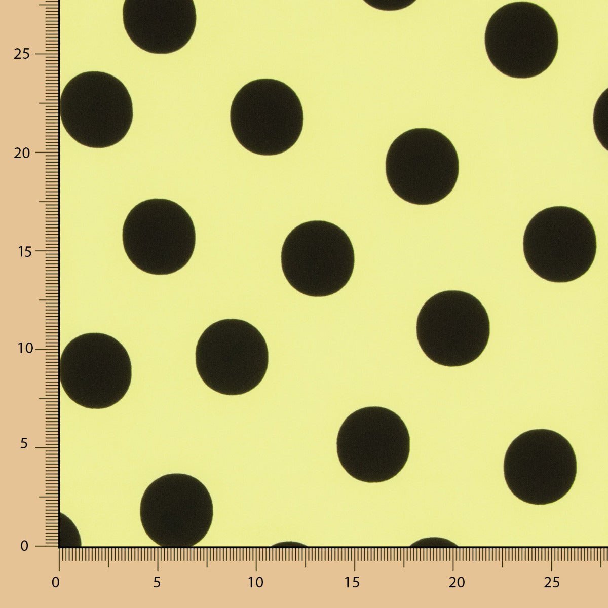 Crepe de lunares 33mm negros sobre fondo lima. Tela de lunares para trajes de flamenca de muy buena calidad y fácil confección. El crepe es una tela con mucho vuelo y caída, textura rugosa. Recuerda al Crespón y al Koshibo pero de una calidad superior. Tela de lunares pequeños para coser trajes de sevillana y flamenca con topos de colores. También se pueden confeccionar blusas, faldas y vestidos con caída. Tamaño de lunar 7 milímetros.