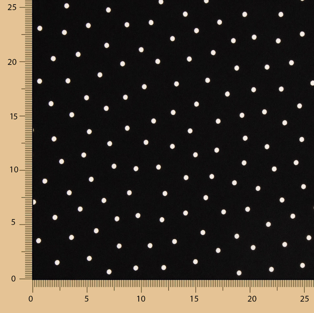 Tela plana elástica de poliéster de estampado de lunares 0,5cm negro. Tela plana con un 3% de elástico con mucha caída textura ligeramente rugosa, ideal para la confección de faldas, pantalones, vestidos de flamenca.
