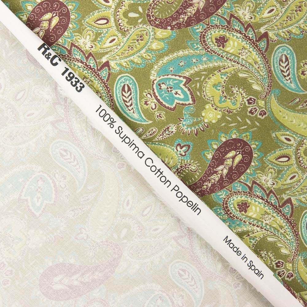 Estampado de moda cachemire en tonos verdes y marrones. Popelín estampado de Algodón Supima de gran calidad, es un tejido con finas hebras de algodón de 5cm de largo, consiguiendo una fortaleza y flexibilidad premium.
