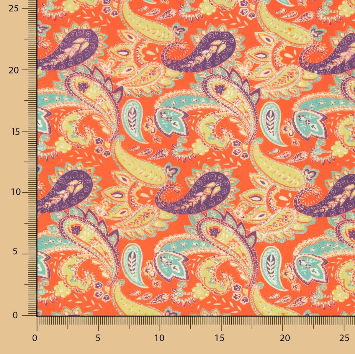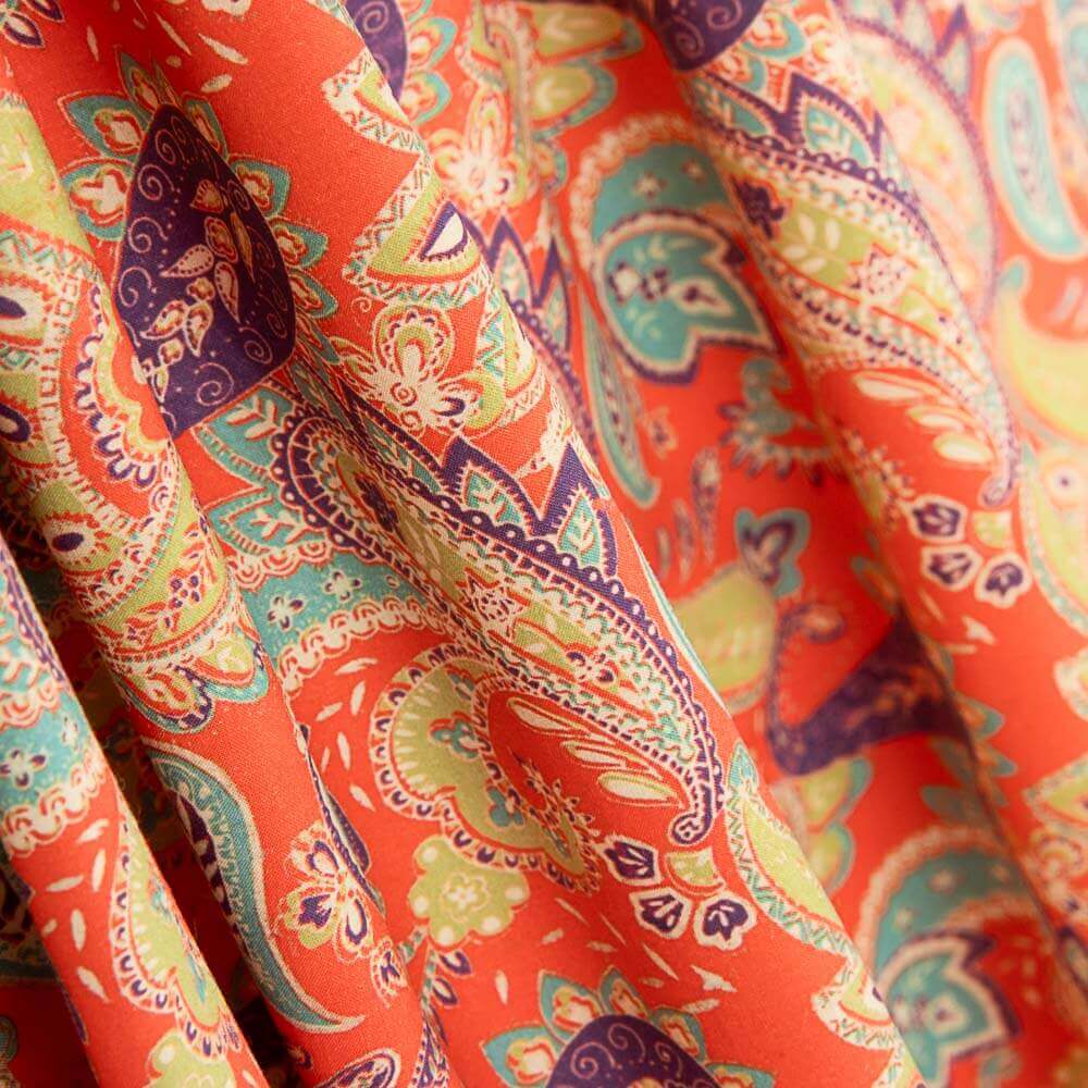Estampado de moda cachemire en tonos naranjas. Popelín estampado de Algodón Supima de gran calidad, es un tejido con finas hebras de algodón de 5cm de largo, consiguiendo una fortaleza y flexibilidad premium.