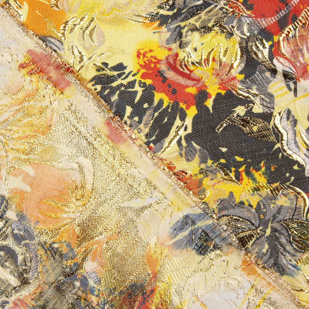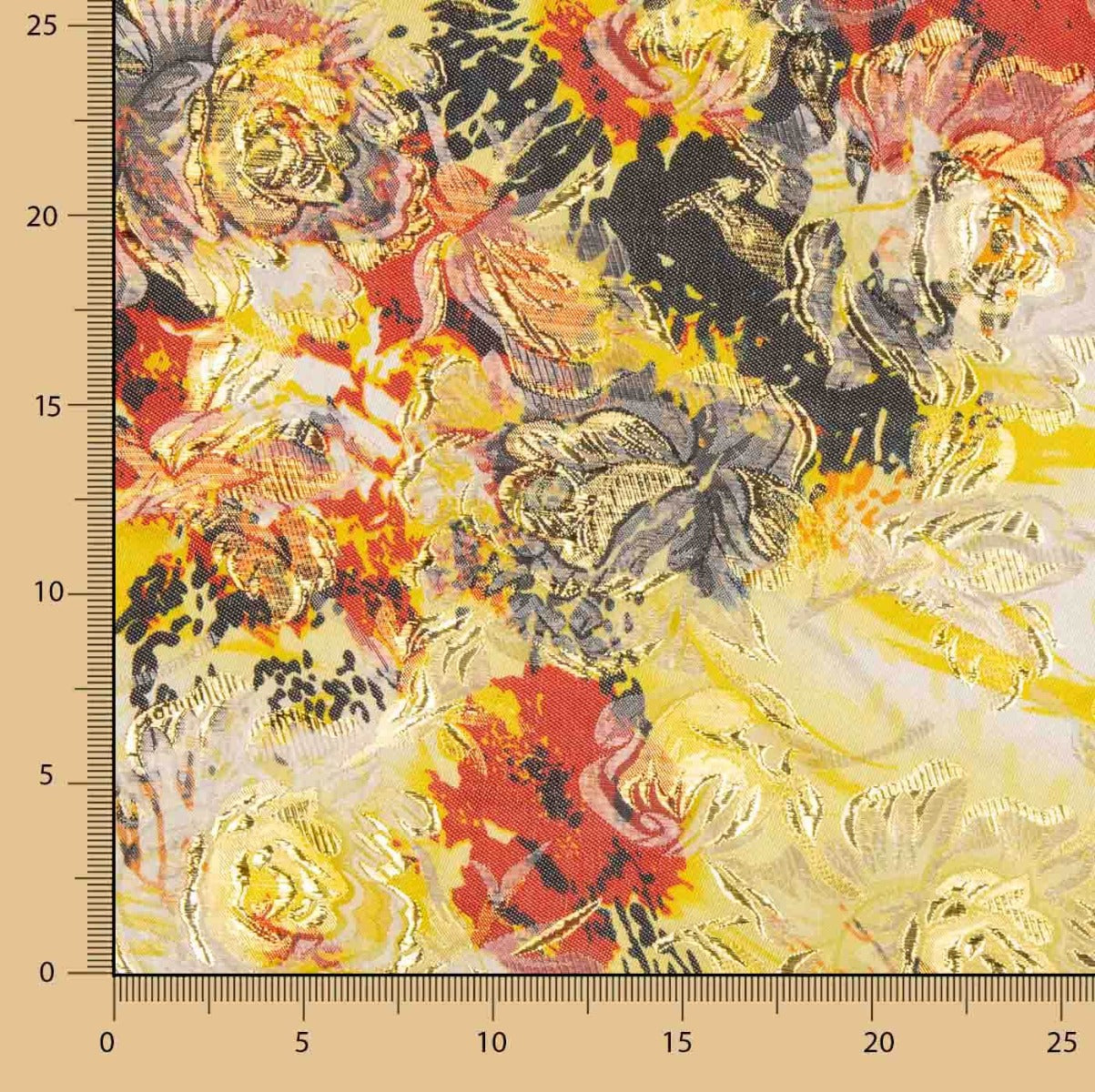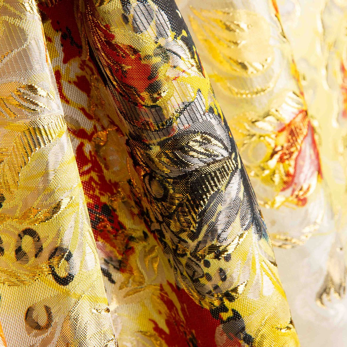 Tela satinada moddelo Ginas de hilaturas metálicas. Tela satinada tejida con hilos metálicos y de colores, aportando un brillo muy característico a la tela. Tela con brillo, sostenida y fina, ideal para prendas de moda, vestidos para espectáculos, telas para disfraces de carnaval. Además es un tejido ideal para confección de monederos, estuches, bolsos y todo tipo de marroquinería.