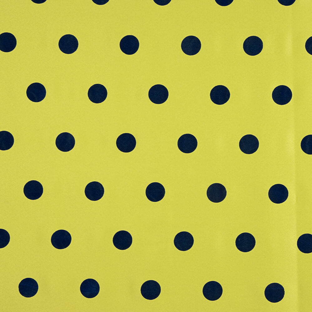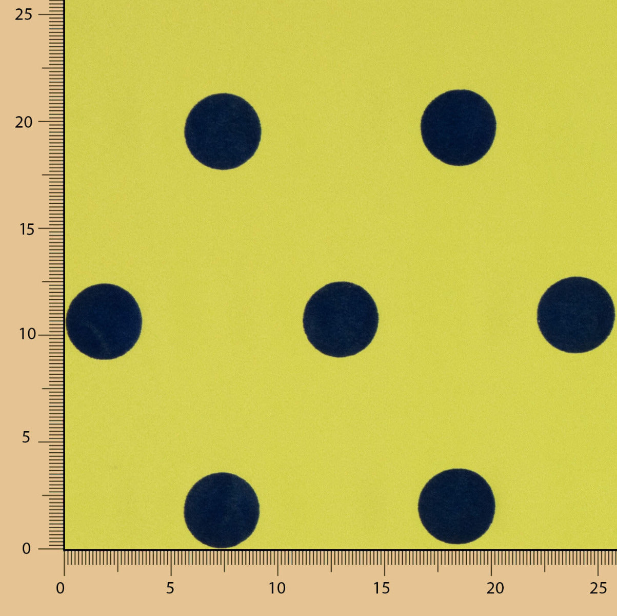 Telas satinadas para comprar por metros, tela con lunar flocado azul de 30mm y fondo lima. Tela stretch con caída, cuerpo y ligera, cierta elasticidad con una de las caras satinada. Ideal para moda flamenca y también es un tejido perfecto para confeccionar pantalones, americanas o blazers, vestidos...y otras más aplicaciones de moda casual.