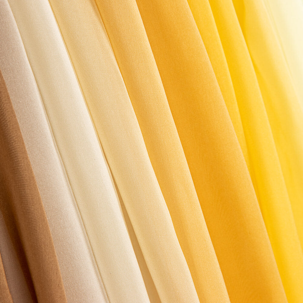 Gasa de seda natural estampada con un degradado amarillos de orillo a orillo de la tela. Tela de seda translúcida, vaporosa y de textura muy suave y muy agradable. La gasa es un complemento básico para la confección de vestidos de fiesta, potenciando el contraste de colores y aportando transparencias y elegancia a las prendas. Ideal para la confección de chales, pañuelos y blusas.