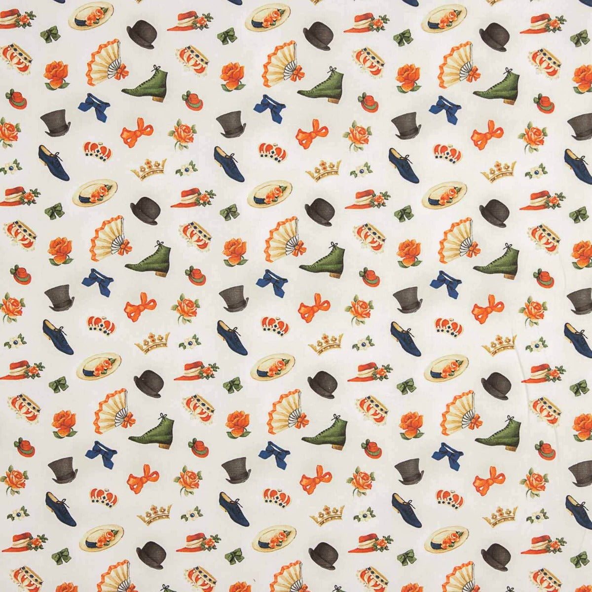 Este popelín de algodón, con un ancho de 150 cm y composición 100% algodón, presenta un estampado vintage encantador de diversos accesorios como sombreros, lazos, flores y coronas.