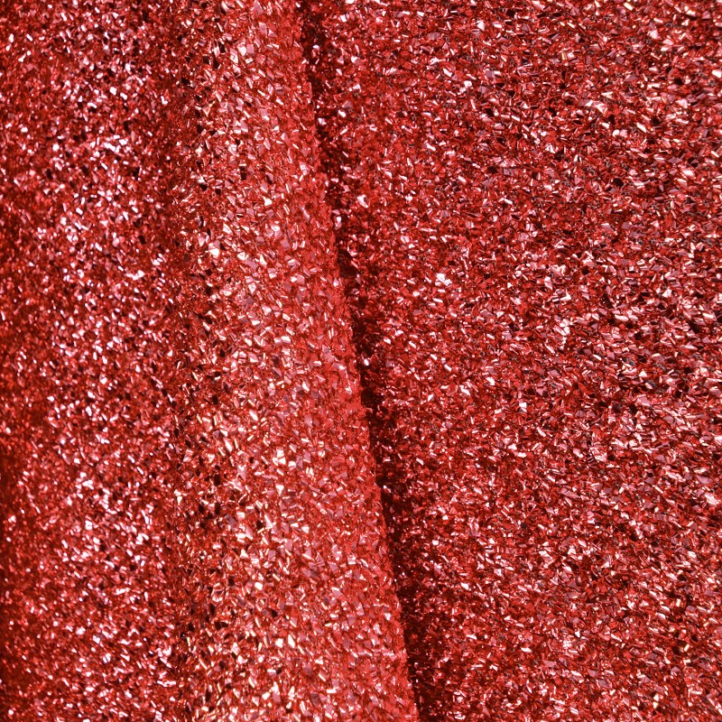 Tela de rafia con virutas creando un efecto metálico de color rojo brillante. Rafia metálica con cuerpo y peso, opaca y adaptable ideal para la confección de disfraces y manualidades.