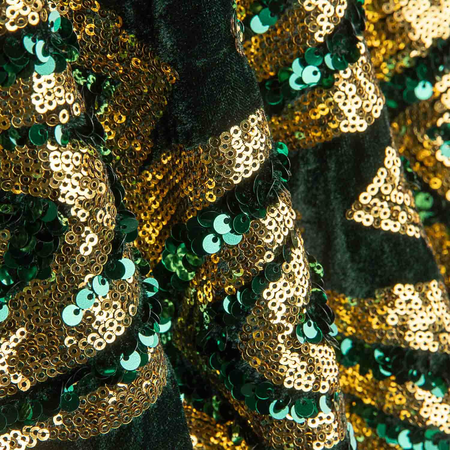 Tela de punto de terciopelo en color verde botella con aplicación de lentejuelas doradas, ideal para confecciones elegantes y de alto impacto visual.