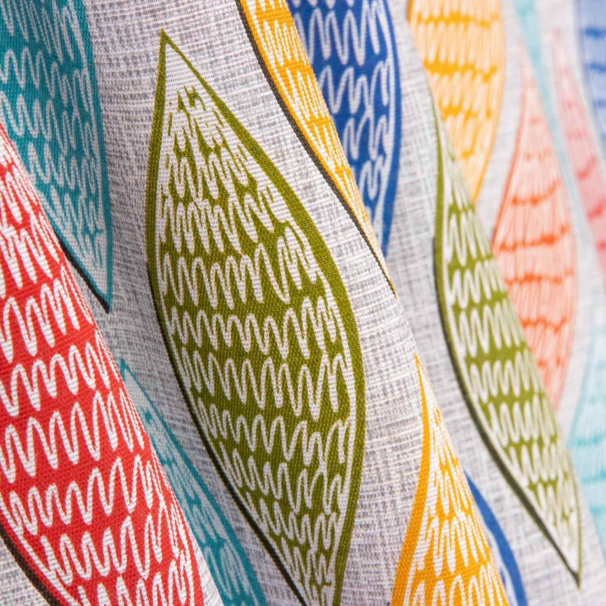 cojines, estores, cortinas o manualidades. Su diseño de hojas estilizadas en tonos vibrantes como rojo, azul, verde y naranja sobre fondo neutro, aporta un toque moderno y alegre a cualquier ambiente.