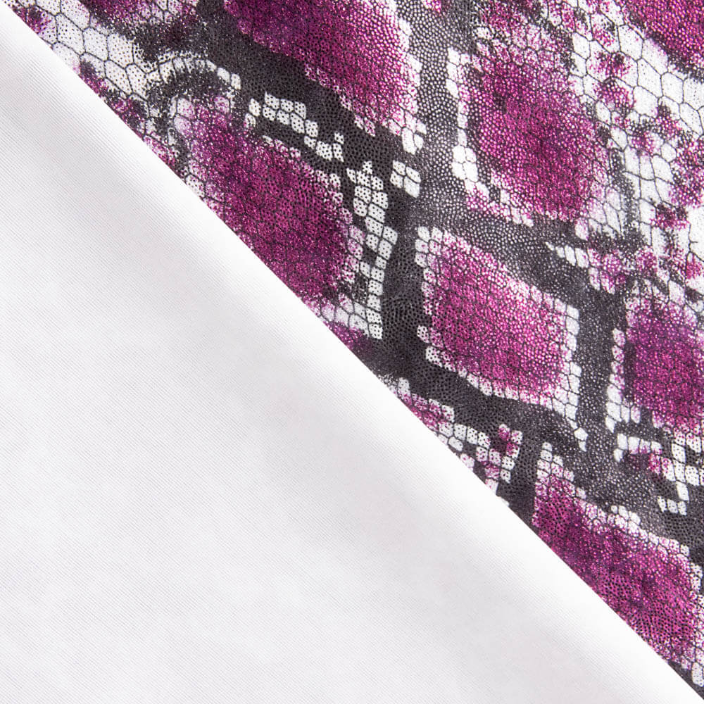Tela de lycra con terciopelo y lámina metalizada con dibujo de serpiente ciclamén.