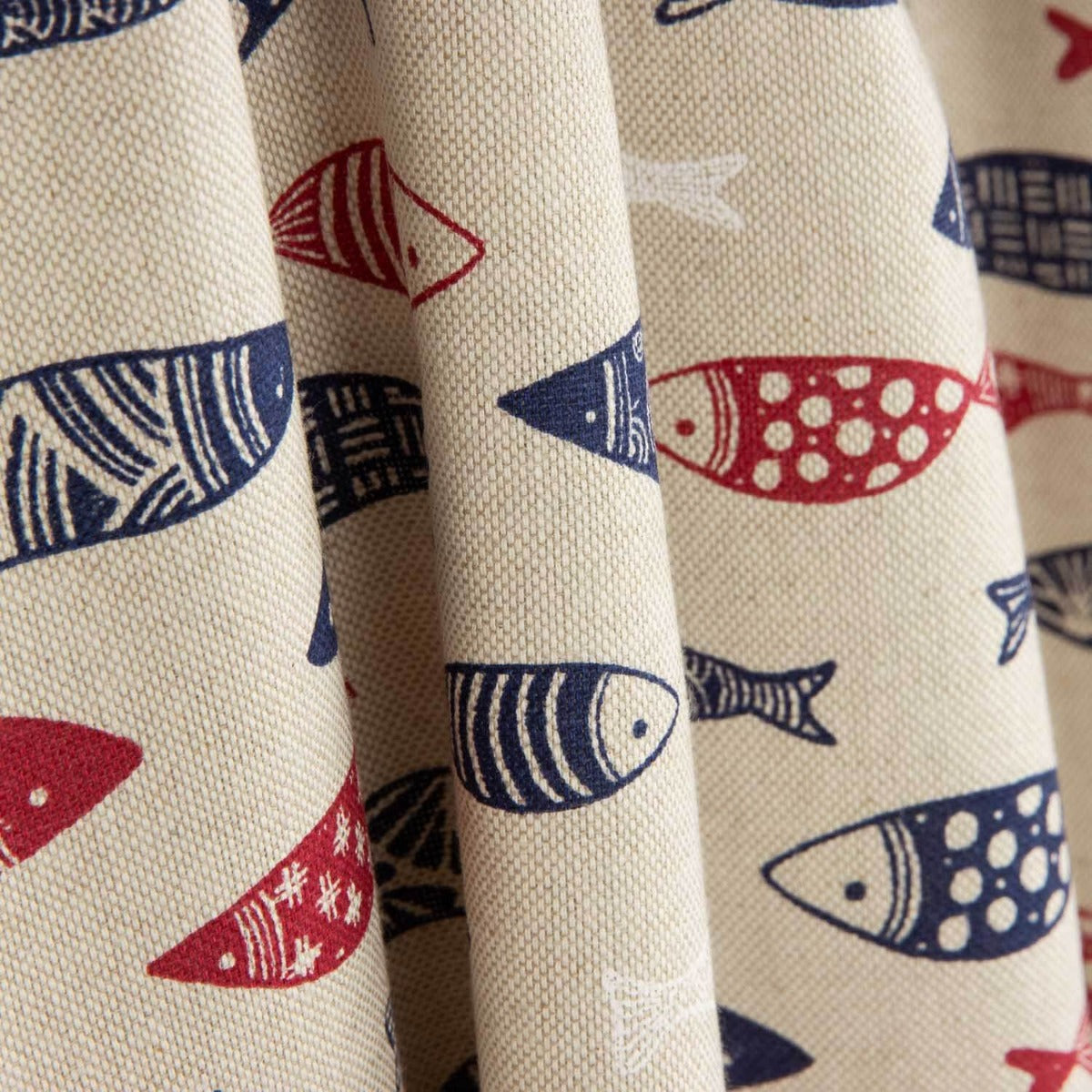 Esta alegre tela Panamá con estampado de peces en tonos rojo, azul marino y blanco sobre fondo natural es perfecta para dar un aire marinero, moderno y con mucho carácter a tus proyectos.