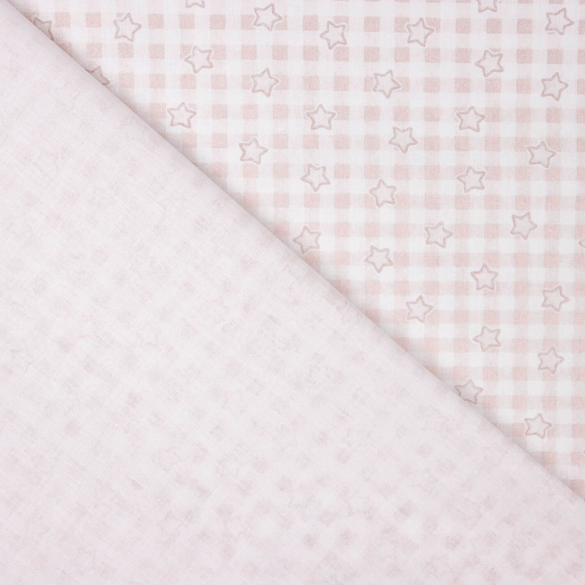 Tela de percal de algodón 100% con un tierno estampado de cuadros vichy en rosa empolvado y delicadas estrellitas contorneadas.