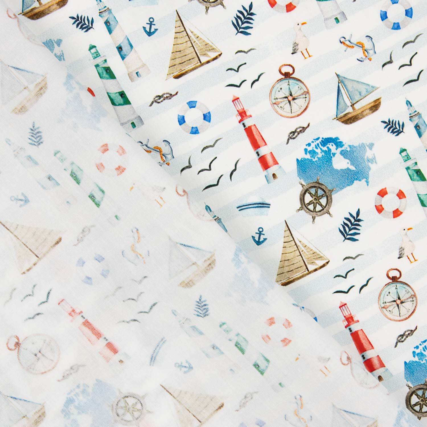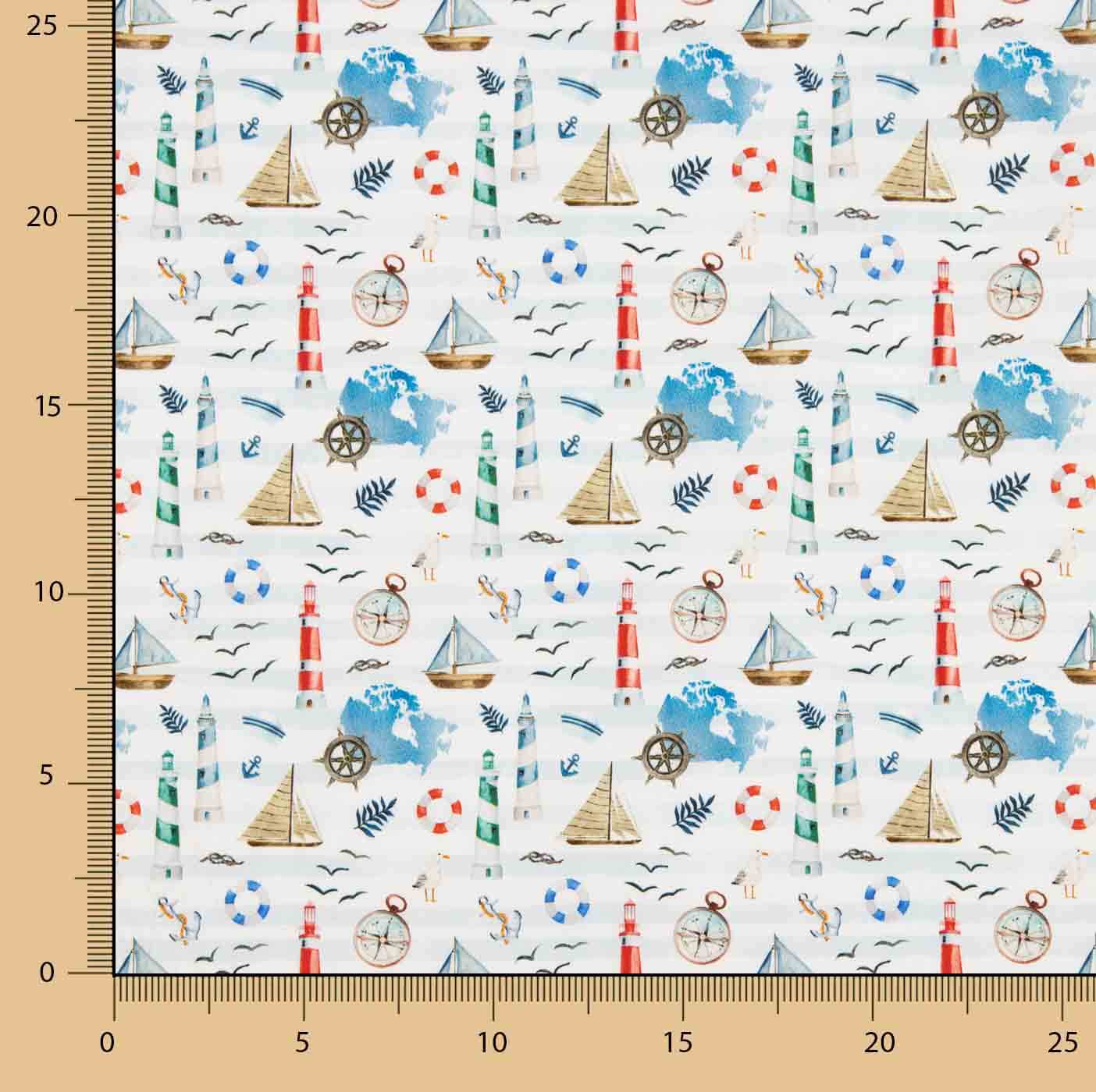 La tela popelín 100% algodón estampado marino presenta un diseño fresco y divertido con motivos náuticos como faros, veleros, brújulas, anclas y salvavidas en tonos rojos, azules y verdes sobre fondo claro, evocando un estilo veraniego y costero.
