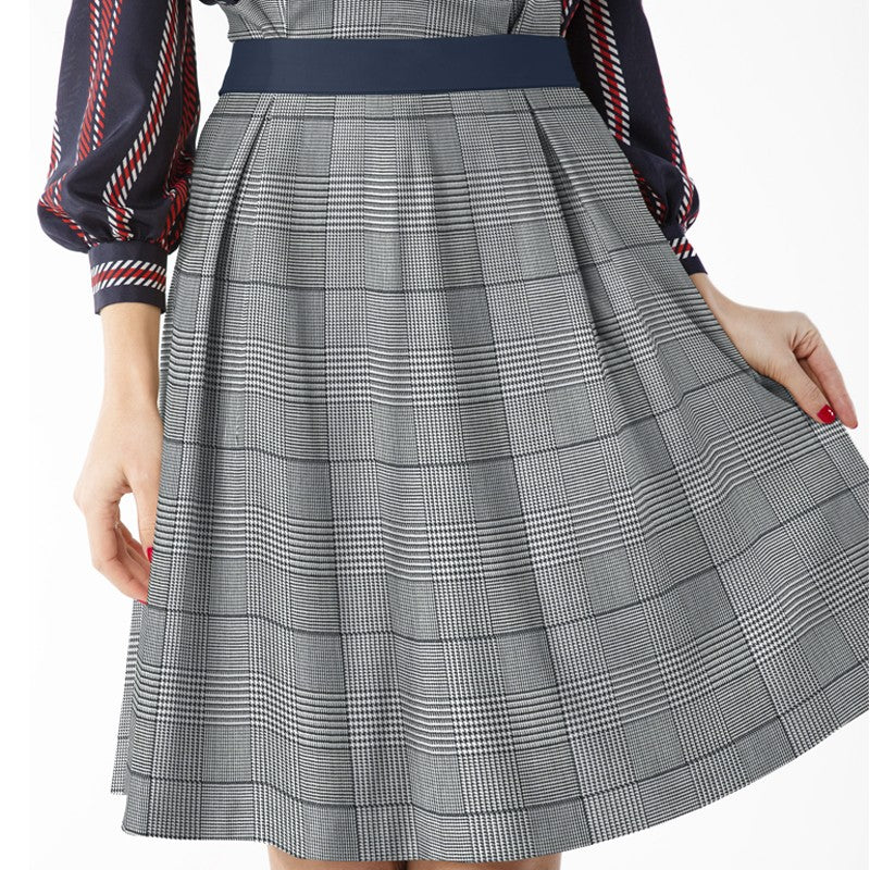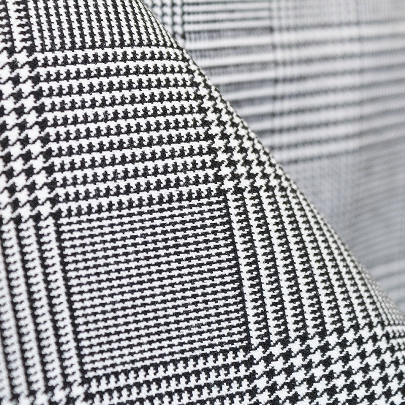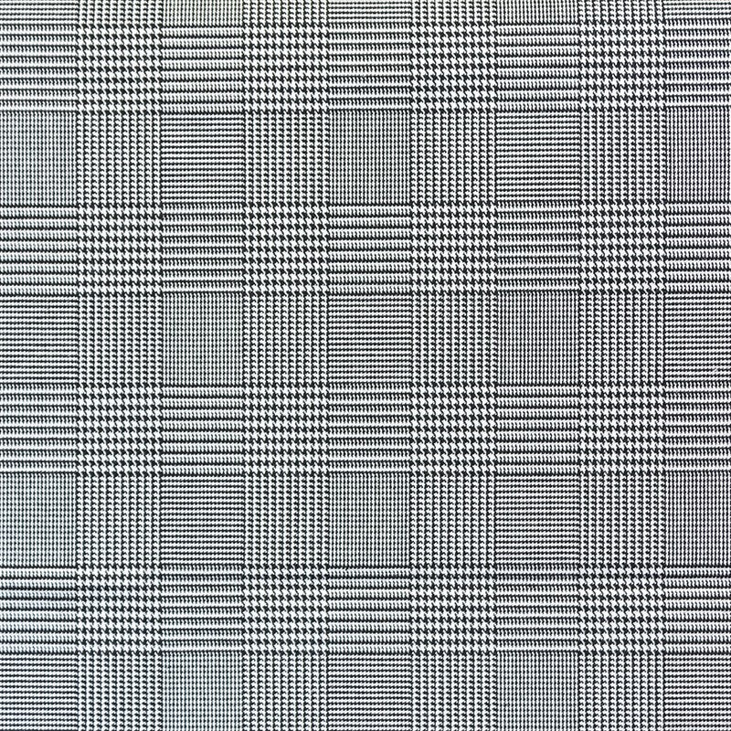 Tela de cuadros de gales de color blanco y negro. El cuadro gales en una tela de sarga con cuerpo y sostenida, que contiene un bajo porcentaje de spandex aportando elasticidad al tejido. El cuadro escocés será tendencia para la temporada otoño invierno para la confección de faldas, vestidos, pantalones y chaquetas.